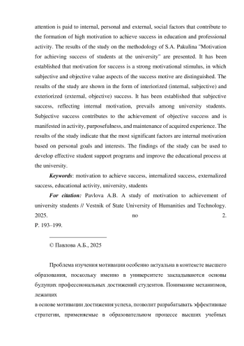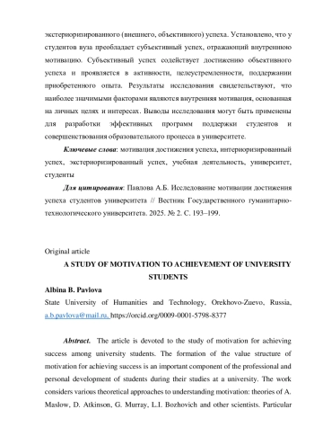 В работе рассматриваются различные теоретические подходы к пониманию мотивации: теории А. Маслоу, Д. Аткинсона, Г. Мюррея, Л. И. Божович и других ученых. Особое внимание уделено внутренним, личностным и внешним, социальным факторам, способствующим формированию высокой мотивации к достижению успехов в обучении и в профессиональной деятельности. Представлены результаты исследования по методике С. А. Пакулиной «Мотивация достижения успеха студентов в вузе».