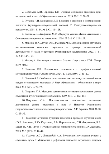 12. Суслова А.С., Линденбой А.А. Мотивация достижения успеха у студентов вузов // Мотивация и рефлексия личности: актуальные вопросы теории и практики: сборник научных трудов по материалам Всероссийских психологических чтений / под ред. Е.Н. Ткач. Хабаровск. 2020. С. 277-281. EDN: BFIITE
