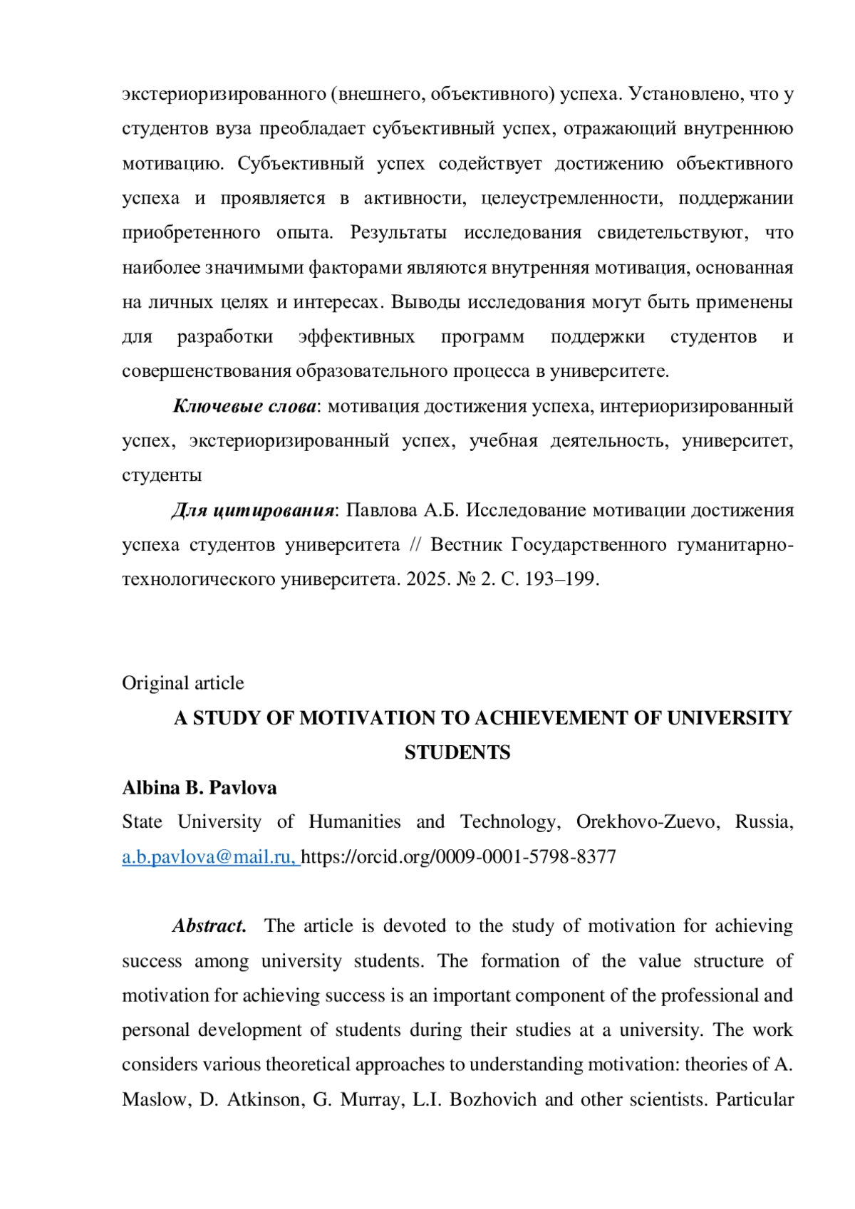 8. Павлова А.Б. Особенности мотивации достижения успеха и избегания неудач студенческой молодежи // Мир образования - образование в мире. 2024. № 1 (93). С. 70-77. EDN: BDYVAE