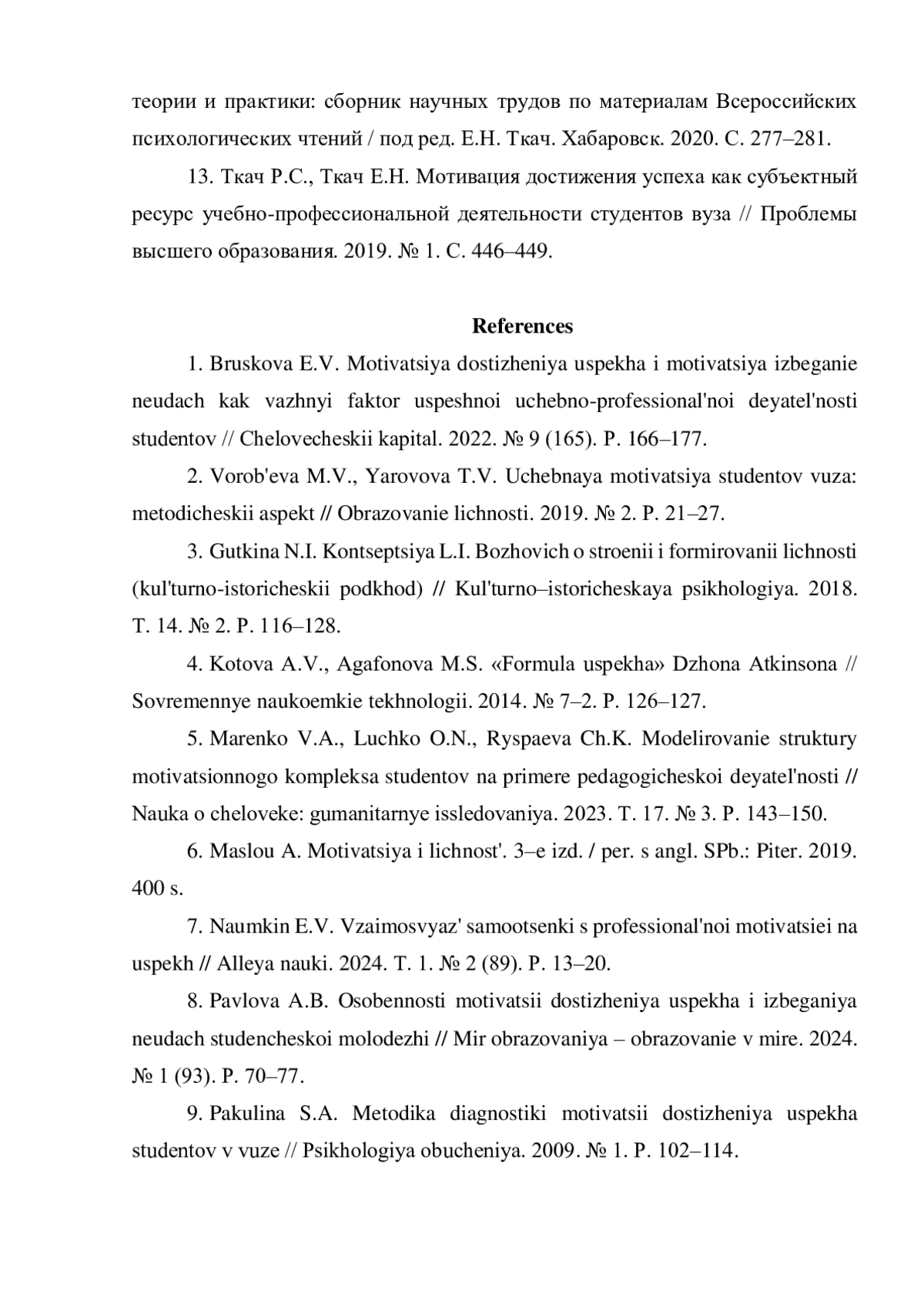 13. Ткач Р.С., Ткач Е.Н. Мотивация достижения успеха как субъектный ресурс учебно-профессиональной деятельности студентов вуза // Проблемы высшего образования. 2019. № 1. С. 446-449. EDN: QYUWMQ