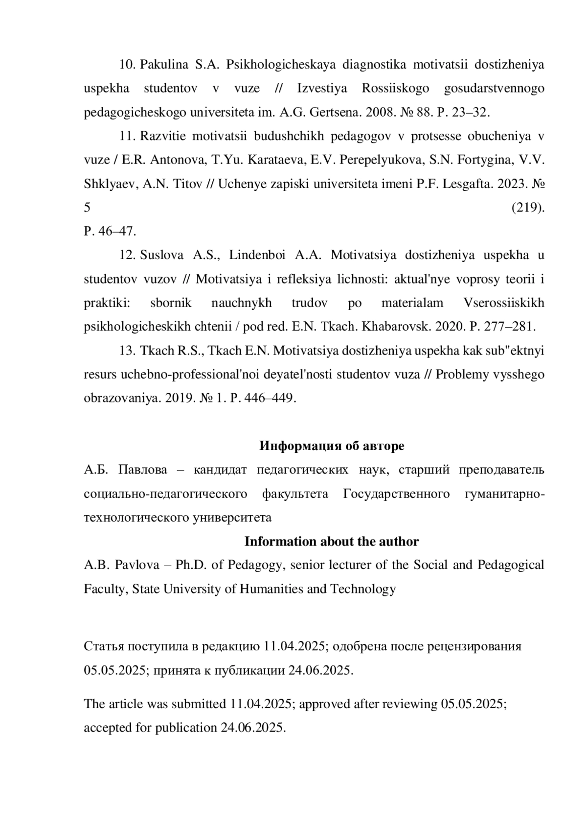 10. Пакулина С.А. Психологическая диагностика мотивации достижения успеха студентов в вузе // Известия Российского государственного педагогического университета им. А.Г. Герцена. 2008. № 88. С. 23-32.