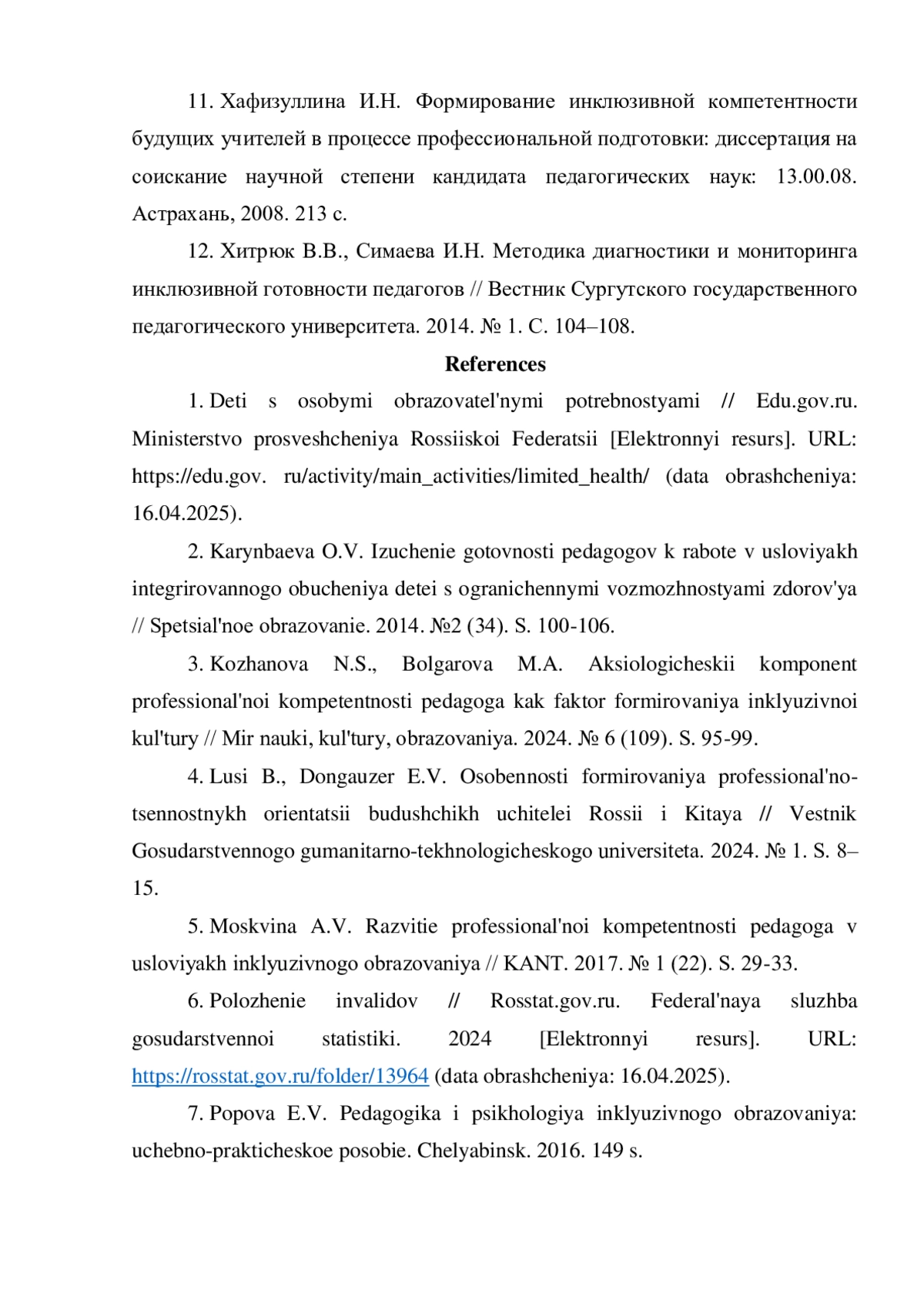 11. Хафизуллина И.Н. Формирование инклюзивной компетентности будущих учителей в процессе профессиональной подготовки: диссертация на соискание научной степени кандидата педагогических наук: 13.00.08. Астрахань, 2008. 213 с. EDN: NQFJFB