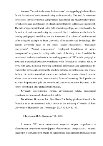 В статье рассматриваются особенности создания педагогических условий для формирования экологической безопасности в университете. Акцентируется необходимость усиленного включения экологической компоненты в образовательные и воспитательные программы для школьников и студентов образовательных организаций России. Приводятся данные экспериментальной работы в области создания педагогических условий формирования экологической безопасности. Такие условия являются базой создания педагогических условий формирования культуры экологической безопасности на примере Государственного гуманитарно-технологического университета. Приводятся авторские разработанные задачи по темам «Социальные чрезвычайные ситуации», «Техногенные чрезвычайные ситуации», «Природные чрезвычайные ситуации», «Экологические основы природопользования». По результатам исследования установлено, что включение экологических заданий в процессе преподавания «БЖ» как на педагогических направлениях, так и на технических специальностях способствует формированию у обучающихся умения работать с данными, в том числе извлекать дополнительную информацию и определять взаимосвязь между явлениями; умения просчитывать возможные варианты и выбирать наилучший; умения проводить исследование и оценивать полученные результаты; позволяет им овладевать новыми, более сложными, формами рассуждений. Такая продуктивная деятельность способствует приобретению учащимися исследовательского и творческого опыта, так необходимое им в будущем, в том числе в профессиональной деятельности.