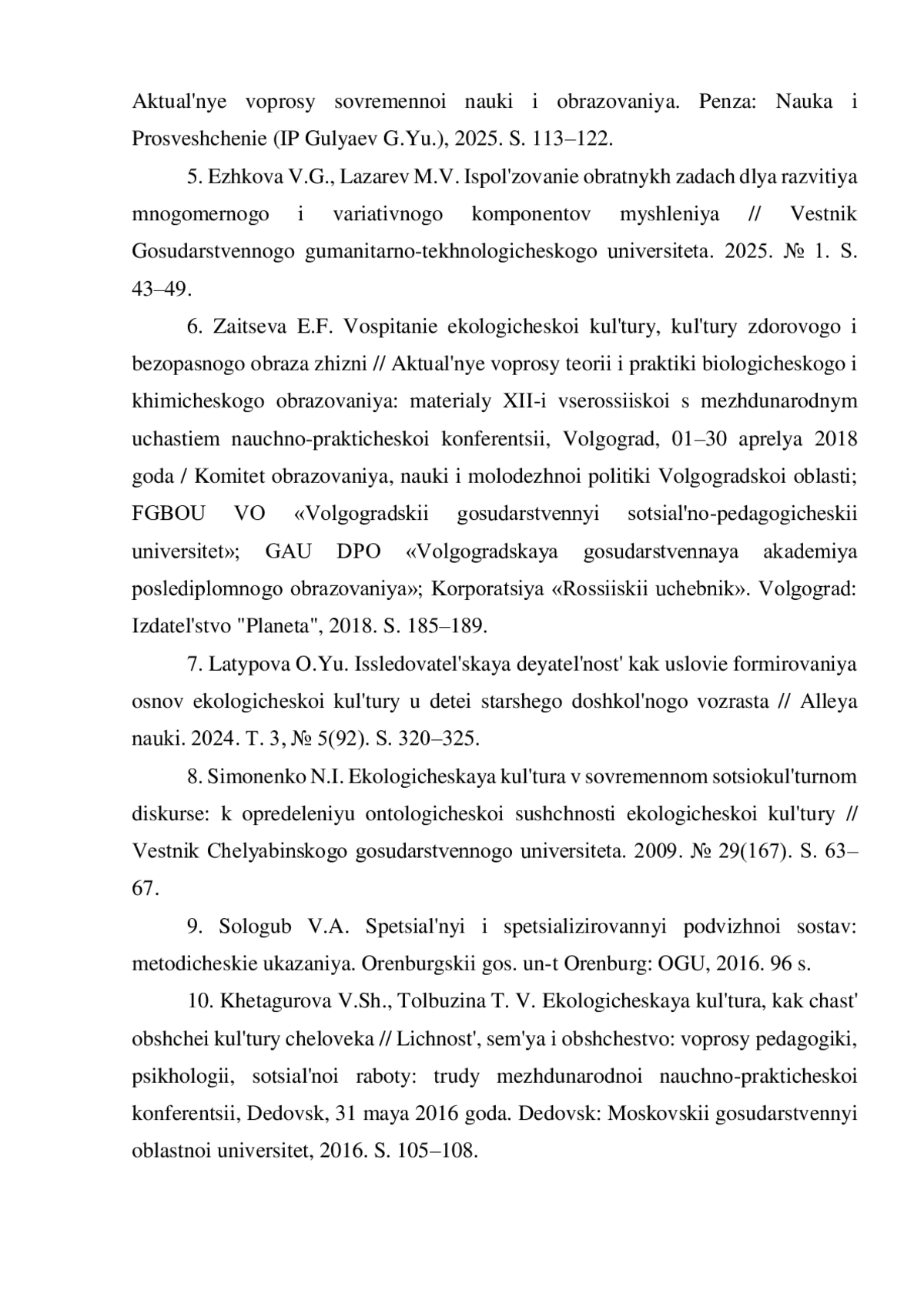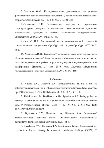 7. Латыпова О.Ю. Исследовательская деятельность как условие формирования основ экологической культуры у детей старшего дошкольного возраста // Аллея науки. 2024. Т. 3, № 5(92). С. 320-325. EDN: QEOYYV