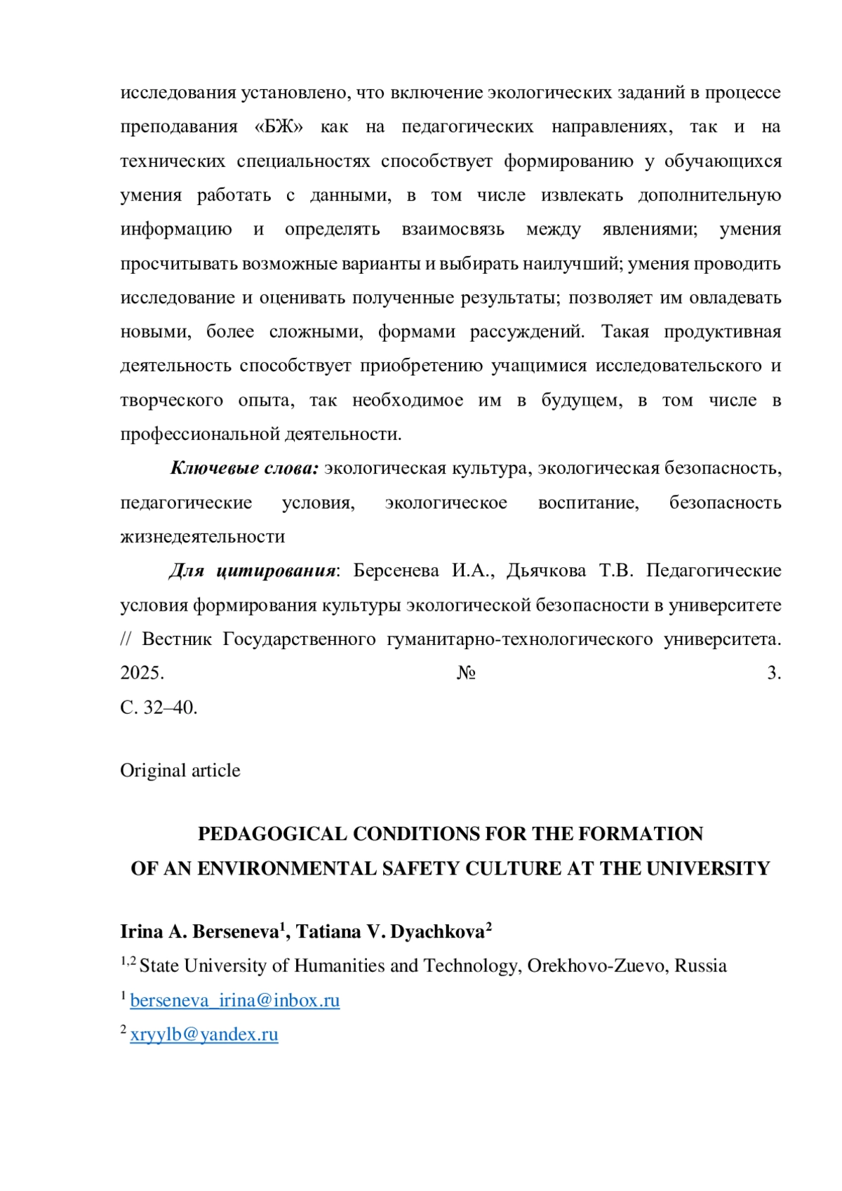 2. Джакупова И.Б., Божбанов А.Ж., Егеубаева С.С. Педагогические условия формирования культуры экологической безопасности в технологическом вузе // Педагогический журнал. 2022. Т. 12, № 5-1. С. 556-566. DOI: 10.34670/AR.2022.55.29.072 EDN: FCXROT