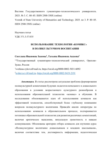 В заключении делается вывод о перспективности использования образовательной технологии «комикс» в обучение будущих педагогов дошкольного и начального образования при изучении курса «Поликультурное воспитание дошкольников и младших школьников». Статья представляет интерес для преподавателей вузов, методистов и студентов, интересующихся вопросами поликультурного воспитания и использования инновационных образовательных технологий в обучении.