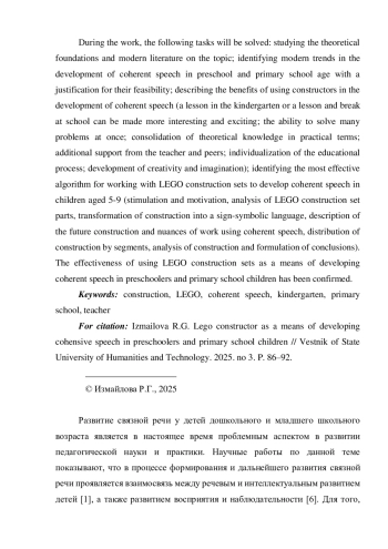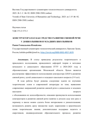 1. Армистова В.И. Развитие связной речи детей старшего дошкольного возраста с помощью Лего-конструирования // Дошкольное образование в условиях трансформационных процессов: сборник научных статей. Минск, 2023. С. 24-27. EDN: DEDJIJ