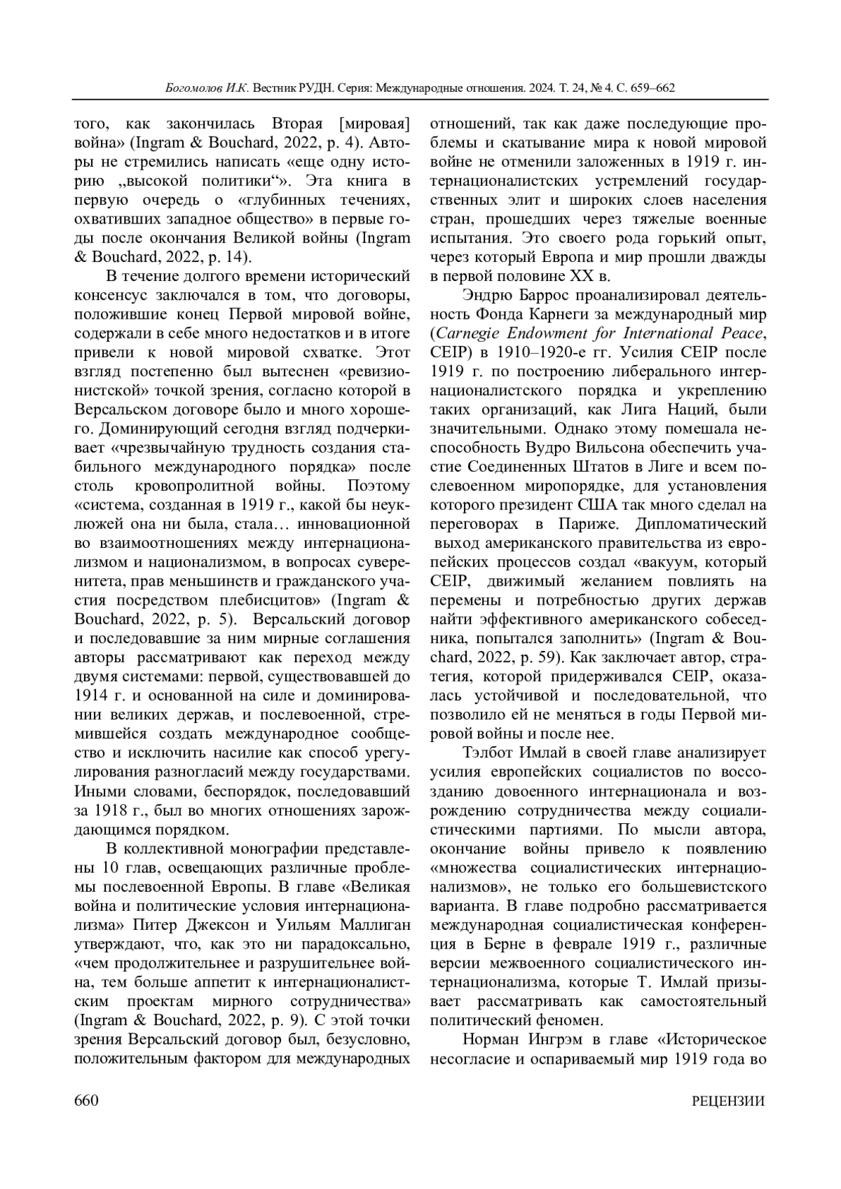 Для цитирования: Богомолов И. К. Рецензия на книгу: Beyond the Great War: Making Peace in a Disordered World / ed. by N. Ingram, C. Bouchard. Toronto: University of Toronto Press, 2022. 239 p. // Вестник Российского университета дружбы народов. Серия: Международные отношения. 2024. Т. 24, № 4. С. 659–662. https://doi. org/10.22363/2313-0660-2024-24-4-659-662