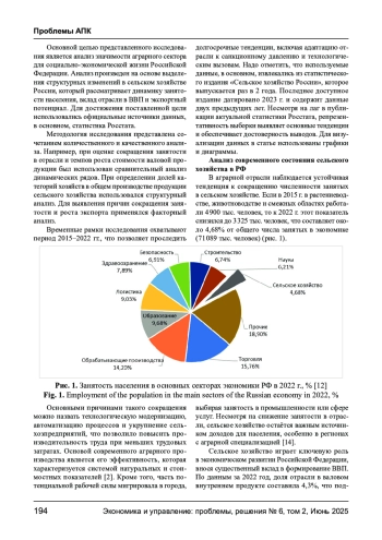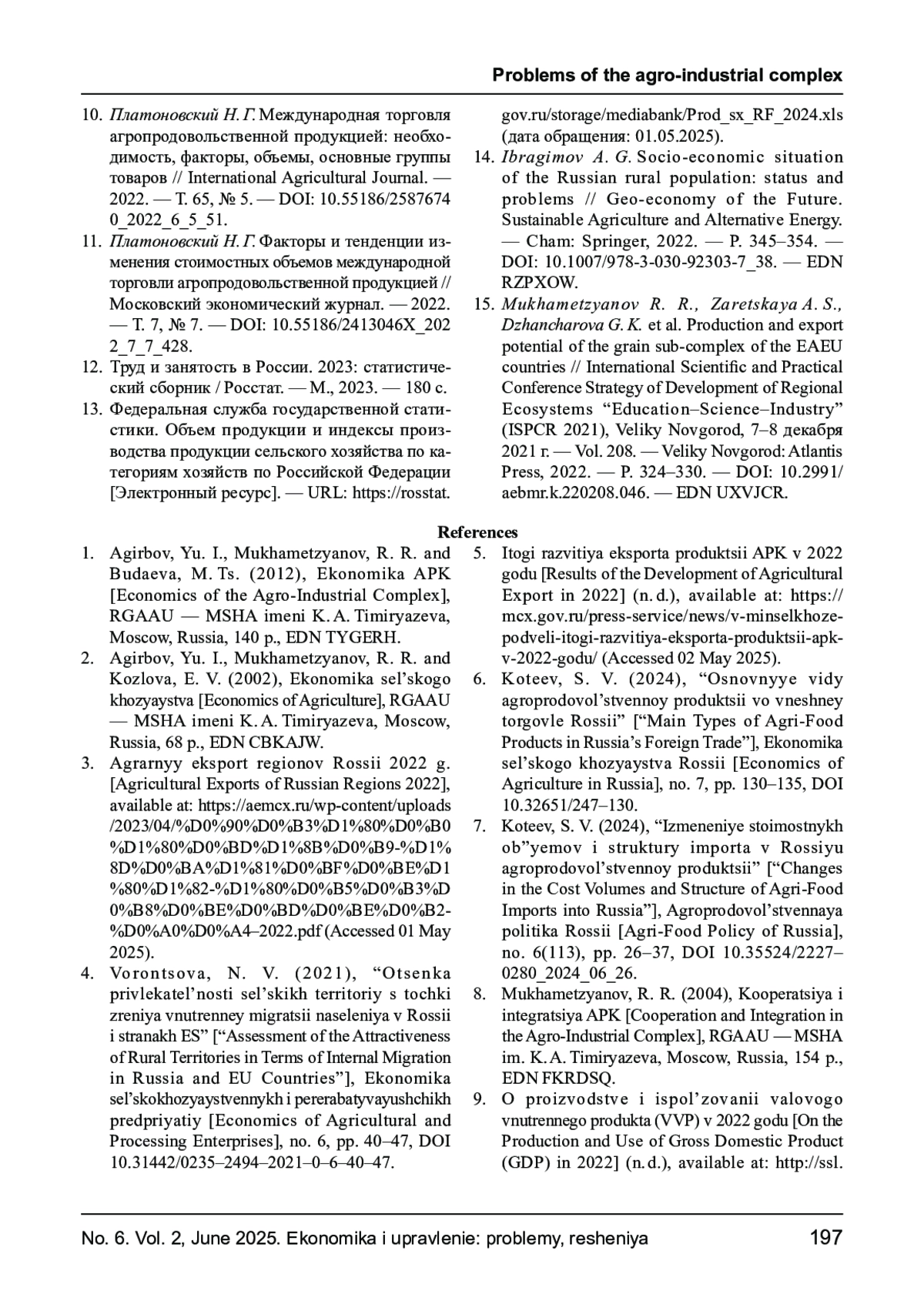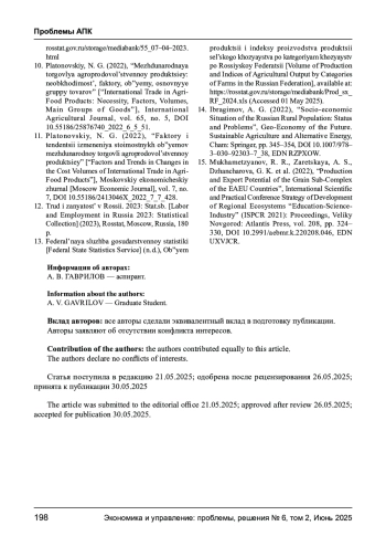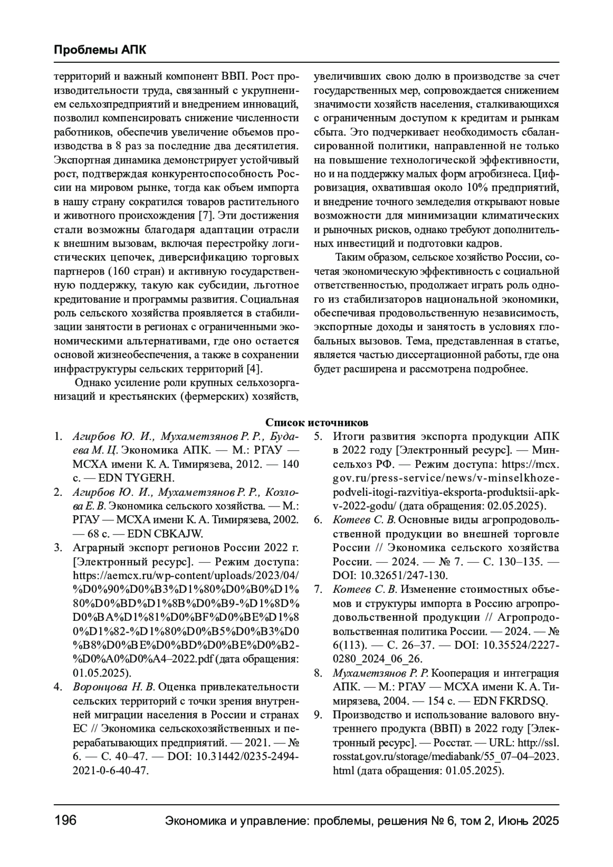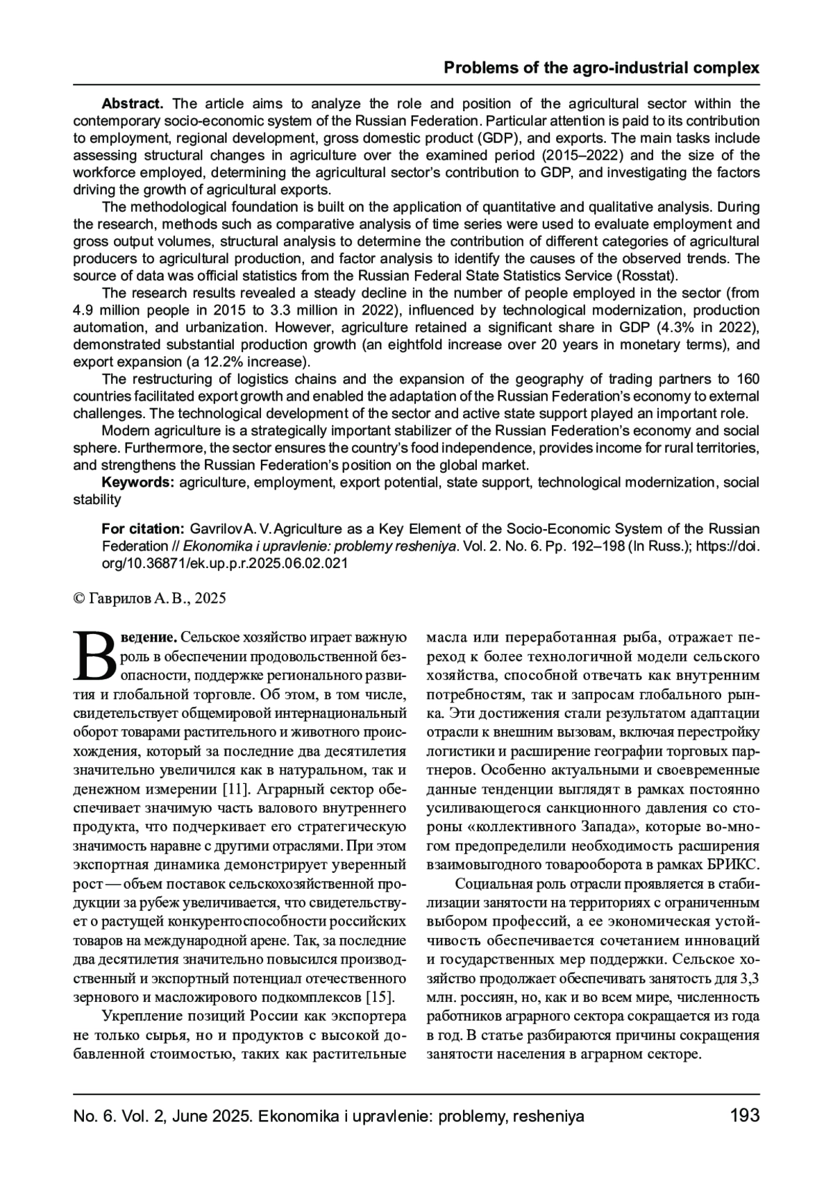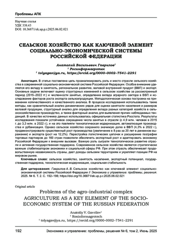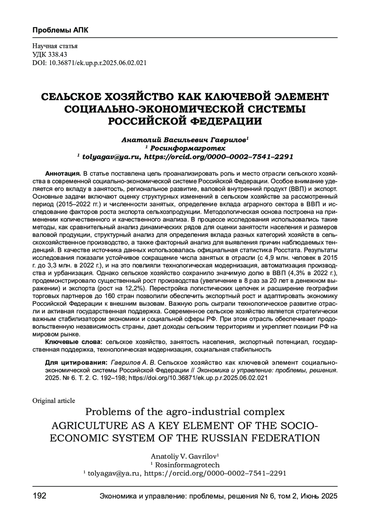 ГАВРИЛОВ А. В. СЕЛЬСКОЕ ХОЗЯЙСТВО КАК КЛЮЧЕВОЙ ЭЛЕМЕНТ СОЦИАЛЬНО-ЭКОНОМИЧЕСКОЙ СИСТЕМЫ РОССИЙСКОЙ ФЕДЕРАЦИИ // ЭКОНОМИКА И УПРАВЛЕНИЕ: ПРОБЛЕМЫ, РЕШЕНИЯ. 2025. ТОМ 2 № 6