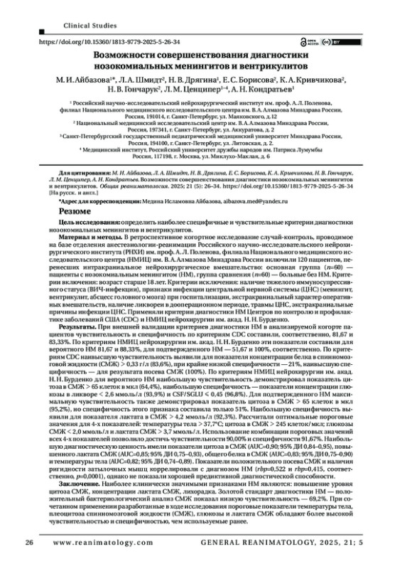 ДРЯГИНА Н. В., АЙБАЗОВА М.И., ШМИДТ Л.А., БОРИСОВА Е.С., КРИВЧИКОВА К.А., ГОНЧАРУК Н.В., ЦЕНЦИПЕР Л. М., КОНДРАТЬЕВ А.Н. ВОЗМОЖНОСТИ СОВЕРШЕНСТВОВАНИЯ ДИАГНОСТИКИ НОЗОКОМИАЛЬНЫХ МЕНИНГИТОВ И ВЕНТРИКУЛИТОВ // ОБЩАЯ РЕАНИМАТОЛОГИЯ. 2025. № 5, ТОМ 21