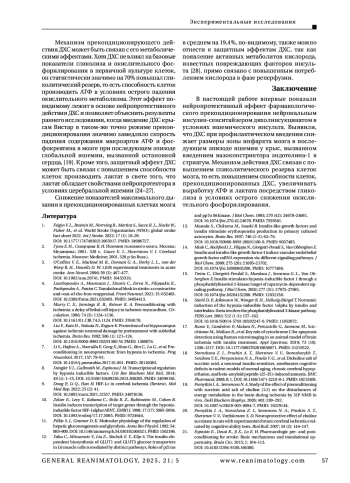 Заключение. Впервые показан нейропротективный эффект фармакологического прекондиционирования нейрональным инсулин-сенситайзером дихолинсукцинатом в условиях ишемического инсульта. Механизм действия ДХС связан с повышением гликолитического резерва клеток мозга, то есть с увеличением способности прекондиционированных клеток вырабатывать АТФ и лактат посредством гликолиза в условиях острого падения окислительного фосфорилирования.