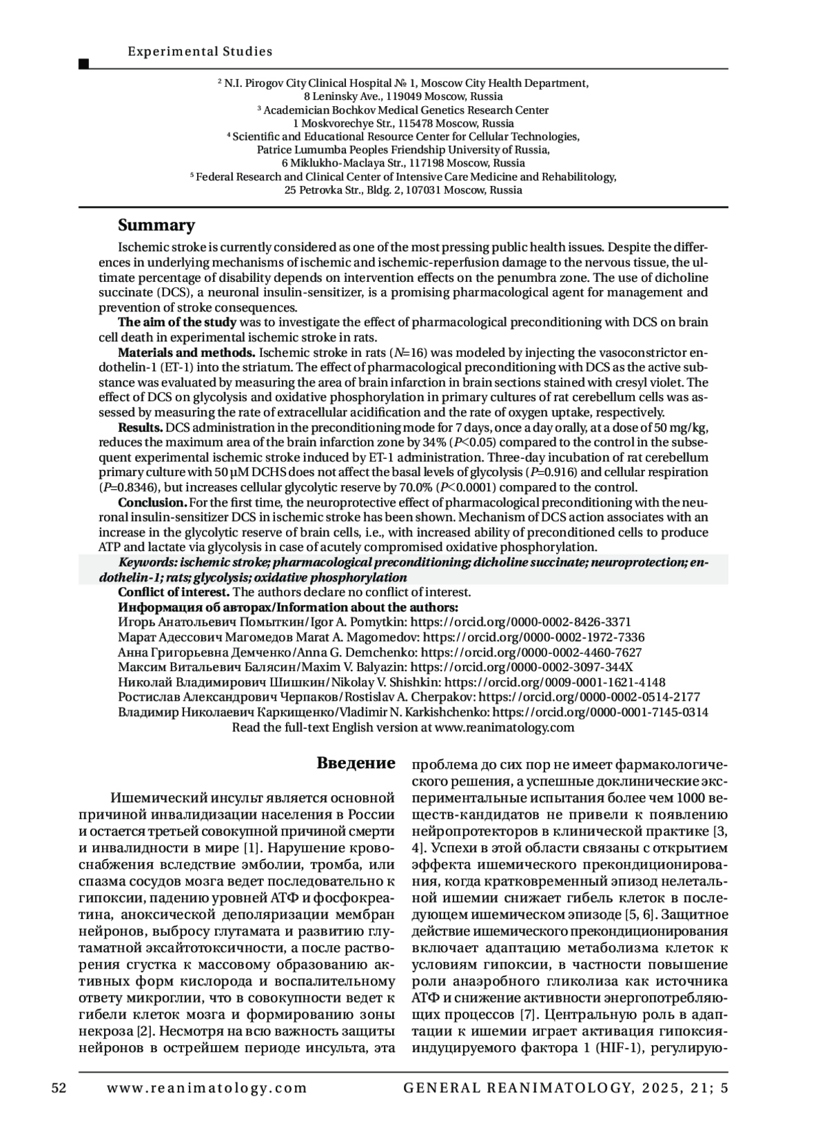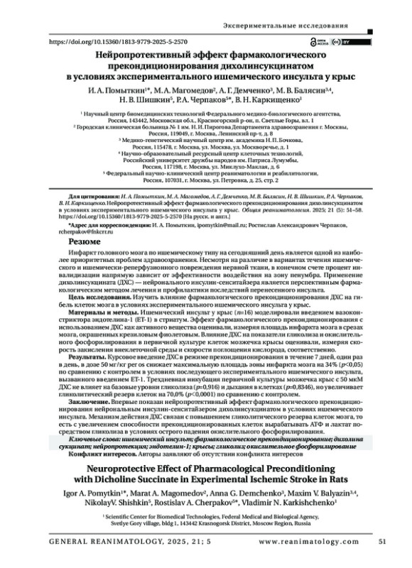 ПОМЫТКИН И. А., МАГОМЕДОВ М. А., ДЕМЧЕНКО А. Г., БАЛЯСИН М. В., ШИШКИН Н.В., ЧЕРПАКОВ Р. А., КАРКИЩЕНКО В.Н. НЕЙРОПРОТЕКТИВНЫЙ ЭФФЕКТ ФАРМАКОЛОГИЧЕСКОГО ПРЕКОНДИЦИОНИРОВАНИЯ ДИХОЛИНСУКЦИНАТОМ В УСЛОВИЯХ ЭКСПЕРИМЕНТАЛЬНОГО ИШЕМИЧЕСКОГО ИНСУЛЬТА У КРЫС // ОБЩАЯ РЕАНИМАТОЛОГИЯ. 2025. № 5, ТОМ 21
