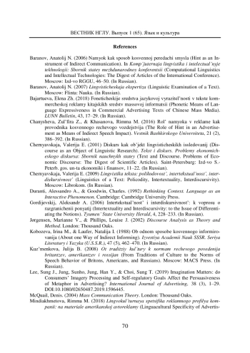 Настоящая работа затрагивает проблематику развертывания смыслового содержания рекламного сообщения. Материалом анализа послужили англоязычные рекламные видеоролики. Цель работы заключается в установлении роли подтекстовой информации, выраженной намеками, в передаче рекламных смыслов. Достижение поставленной цели предполагает выявление специфики смысловой интерпретации адресатом неявно выраженного содержания рекламного текста. В основу исследования положена гипотеза о том, что понимание и толкование рекламных смыслов получателем сообщения происходит путем дешифровки контекстов намекания, преднамеренно сконструированных автором. Прочтение намеков в рекламе представляет собой процедуру смысловой интерпретации внутри- и интердискурсивного взаимодействия знаков и кодов рекламного текста. Выявляются способы создания намеков на вербальном и невербальном уровнях рекламы. Устанавливаются прагматические задачи, решаемые посредством намеков в коммерческой рекламе. Автор приходит к выводу о том, что наложение знаков и кодов культуры в рекламном сообщении, а также их взаимодействие с кодами иных дискурсивных практик способствует косвенной передаче информации, нужной для заказчика рекламы. Определяются следующие виды информации, транслируемые посредством намеков: эмоционально-оценочная, концептуальная, идеологическая и культурная. Особое значение в смысловом развертывании рекламного содержания приобретают знаки лингвокультуры, обеспечивающие интертекстуальные связи между рекламными смыслами и культурным опытом индивида, что, в свою очередь, обогащает смысловой код рекламы. Подключение данных знаков в рекламный контент оптимизирует речевое воздействие и манипуляцию массовым сознанием.