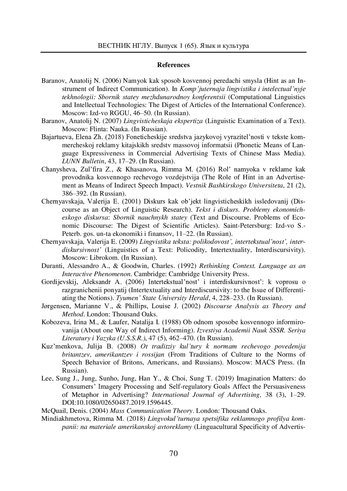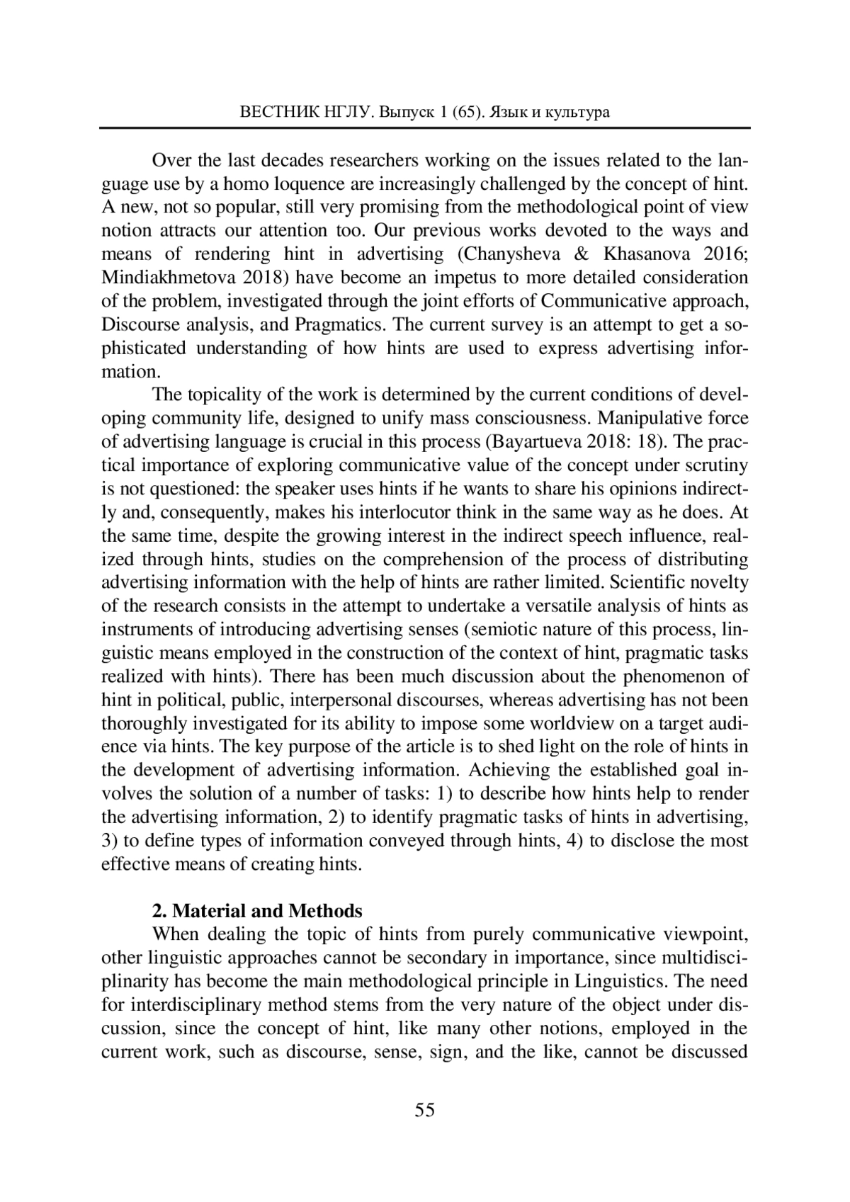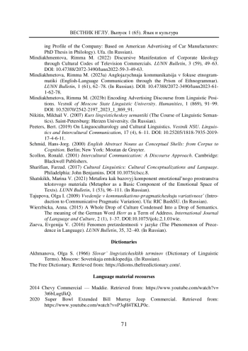 МИНДИАХМЕТОВА Р. М. ИНТЕРДИСКУРСИВНОЕ РАЗВЕРТЫВАНИЕ РЕКЛАМНОЙ ИНФОРМАЦИИ В ФОРМЕ НАМЕКА // ВЕСТНИК НИЖЕГОРОДСКОГО ГОСУДАРСТВЕННОГО ЛИНГВИСТИЧЕСКОГО УНИВЕРСИТЕТА ИМ. Н. А. ДОБРОЛЮБОВА. 2024. № 65
