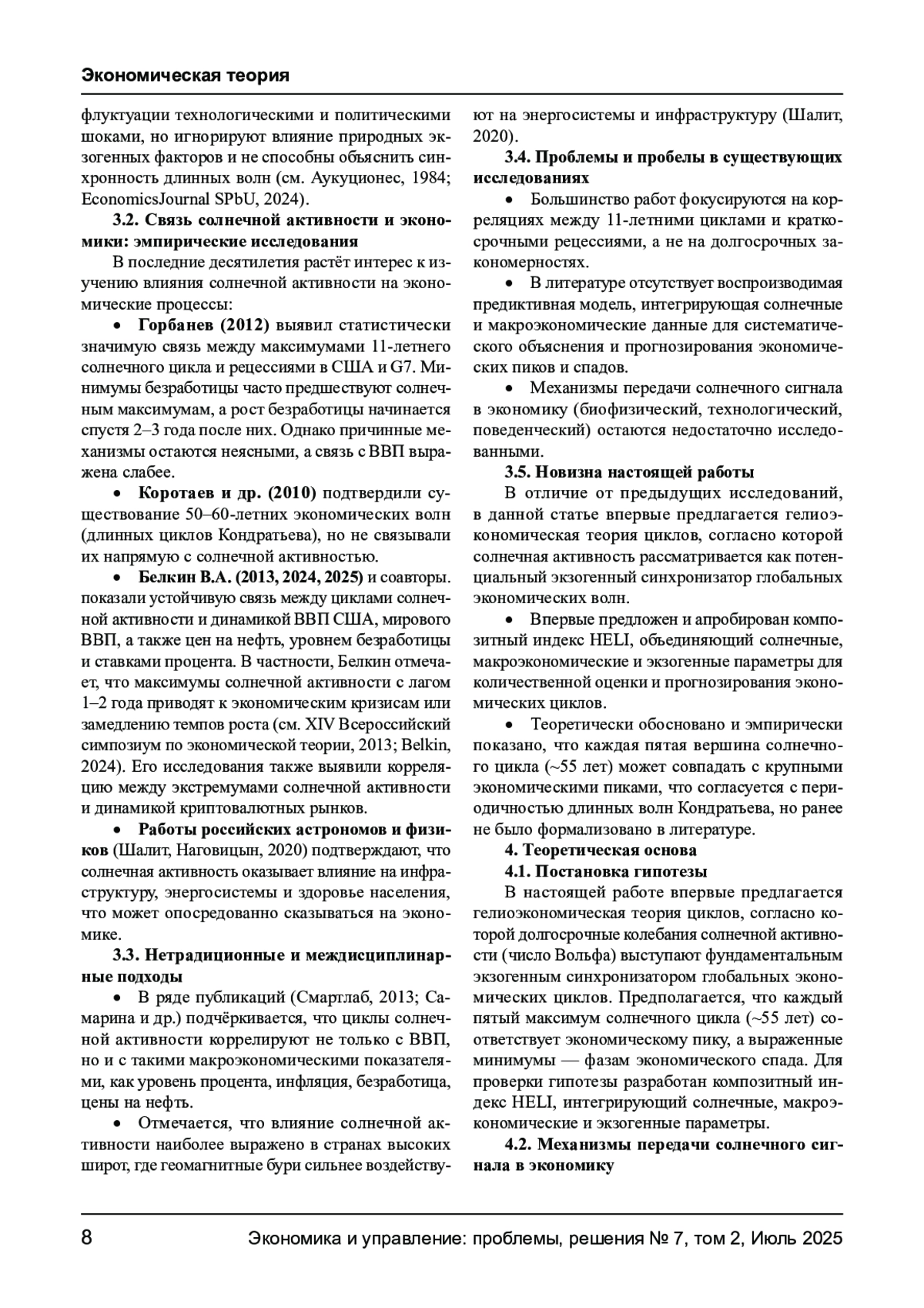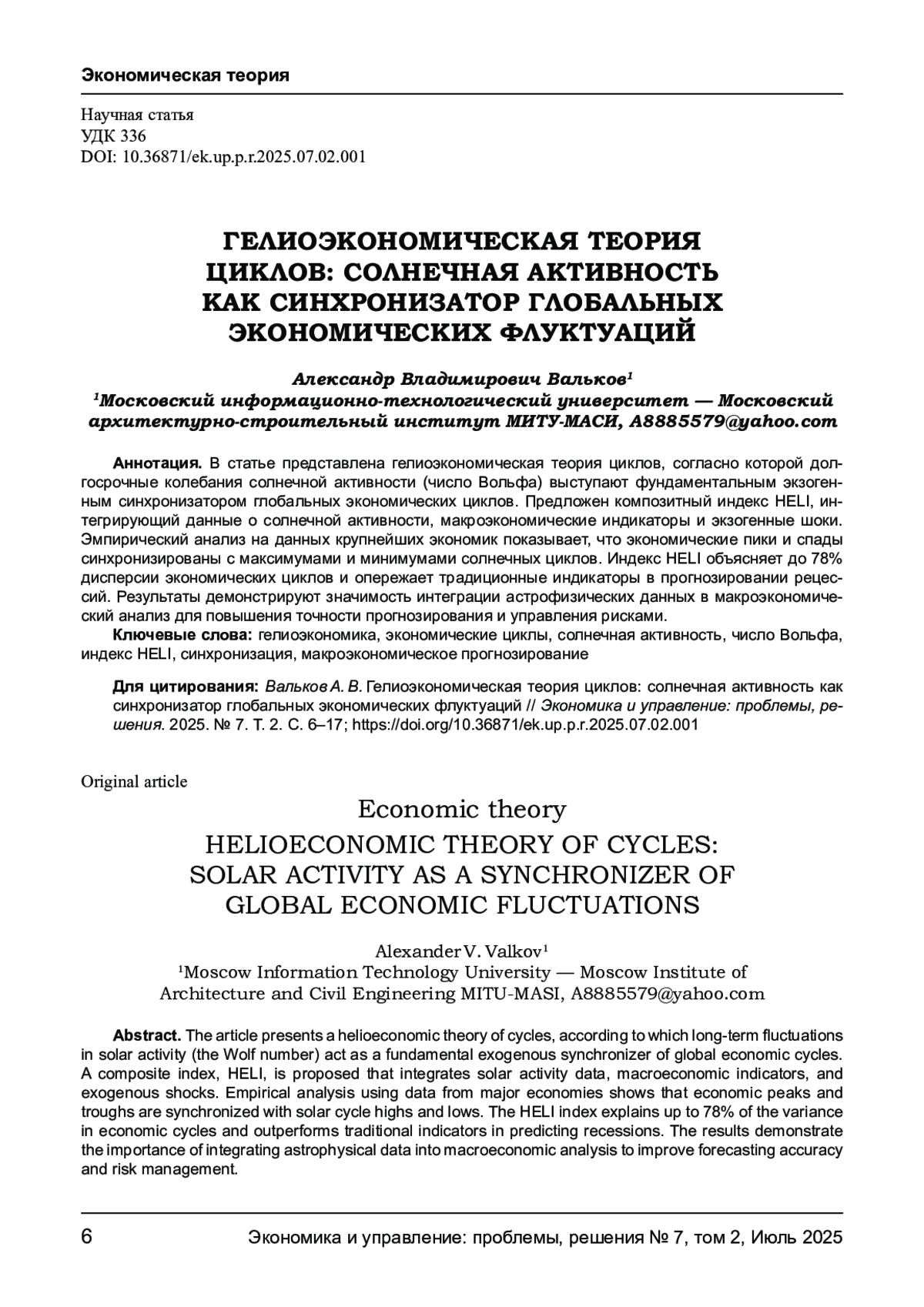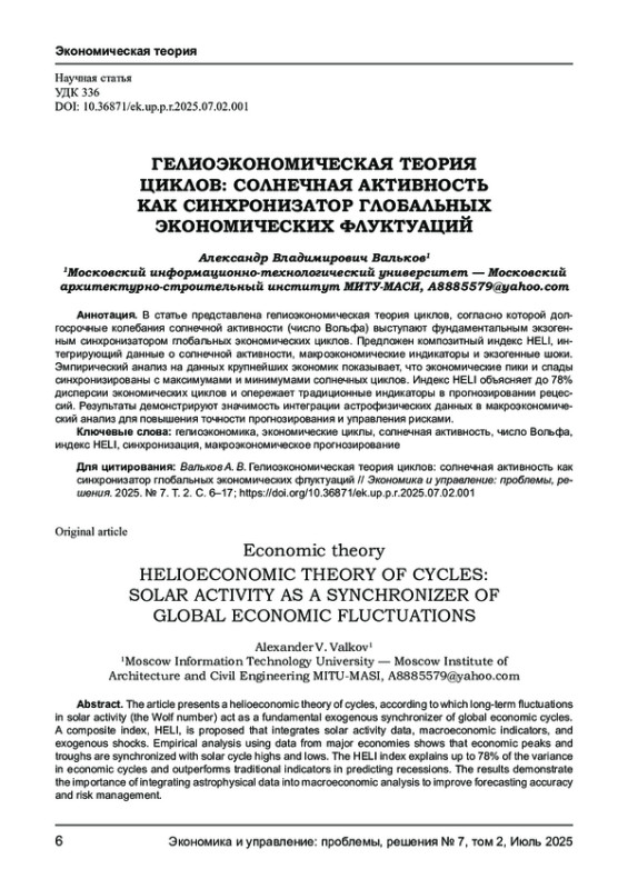 В статье представлена гелиоэкономическая теория циклов, согласно которой долгосрочные колебания солнечной активности (число Вольфа) выступают фундаментальным экзогенным синхронизатором глобальных экономических циклов. Предложен композитный индекс HELI, интегрирующий данные о солнечной активности, макроэкономические индикаторы и экзогенные шоки. Эмпирический анализ на данных крупнейших экономик показывает, что экономические пики и спады синхронизированы с максимумами и минимумами солнечных циклов. Индекс HELI объясняет до 78% дисперсии экономических циклов и опережает традиционные индикаторы в прогнозировании рецессий. Результаты демонстрируют значимость интеграции астрофизических данных в макроэкономический анализ для повышения точности прогнозирования и управления рисками.