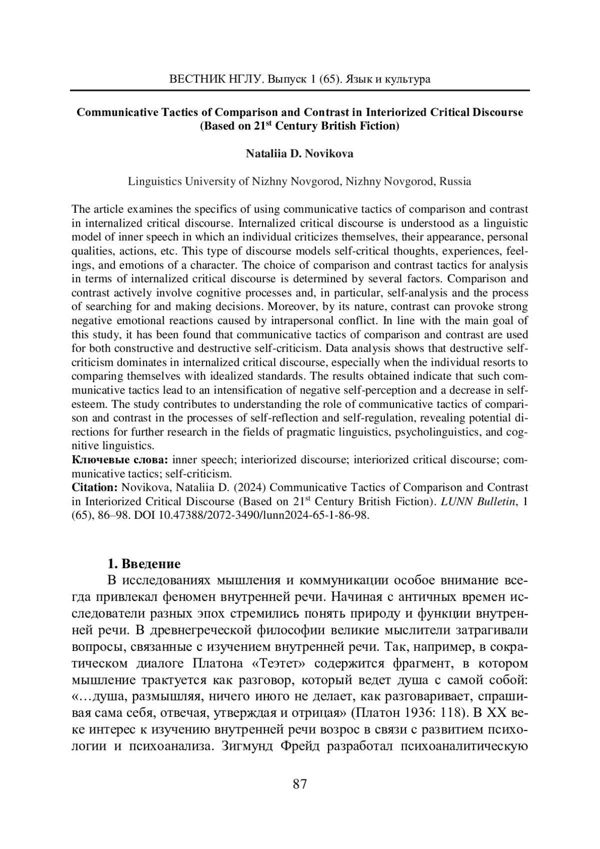 В статье представлены результаты исследования, посвященного анализу специфики использования коммуникативных тактик сравнения и противопоставления в интериоризованном критическом дискурсе. Интериоризованный критический дискурс рассматривается как лингвистическая модель внутренней речи, в которой индивид критикует себя, свою внешность, личные качества, поступки и т. д. В таком типе дискурса моделируются самокритические мысли персонажа, его переживания, чувства и эмоции. Выбор тактик сравнения и противопоставления для анализа в интериоризованном критическом дискурсе обусловлен несколькими факторами. Сравнение и противопоставление активно задействуют когнитивные процессы, в частности самоанализ, процесс поиска и принятия решения. Кроме того, противопоставление по своей природе может вызывать сильные негативные эмоциональные реакции, обусловленные внутриличностным конфликтом. В соответствии с главной целью настоящего исследования было выявлено, что коммуникативные тактики сравнения и противопоставления применяются для реализации как конструктивной, так и деструктивной самокритики. Анализ данных показывает, что деструктивная самокритика доминирует в интериоризованном критическом дискурсе, особенно когда личность прибегает к сравнению себя с идеализированными стандартами. Полученный результат указывает на то, что такие коммуникативные тактики приводят к усилению негативного самовосприятия и снижению самооценки. Исследование вносит вклад в понимание роли коммуникативных тактик сравнения и противопоставления в процессах саморефлексии и саморегуляции, раскрывая потенциальные направления для дальнейших исследований в области прагматической лингвистики, психолингвистики и когнитивной лингвистики.