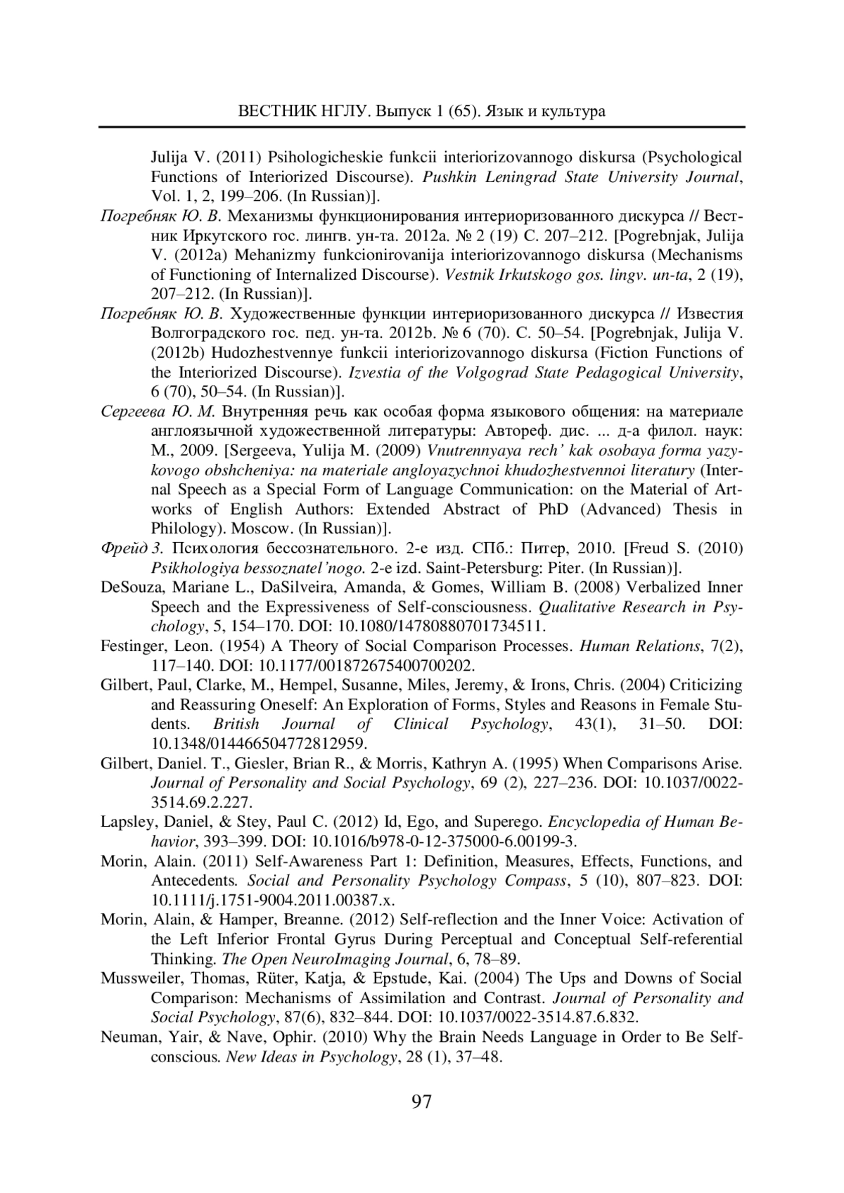 17. DeSouza, Mariane L., DaSilveira, Amanda, & Gomes, William B. (2008) Verbalized Inner Speech and the Expressiveness of Self-consciousness. Qualitative Research in Psychology, 5, 154-170. DOI: 10.1080/14780880701734511