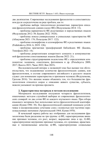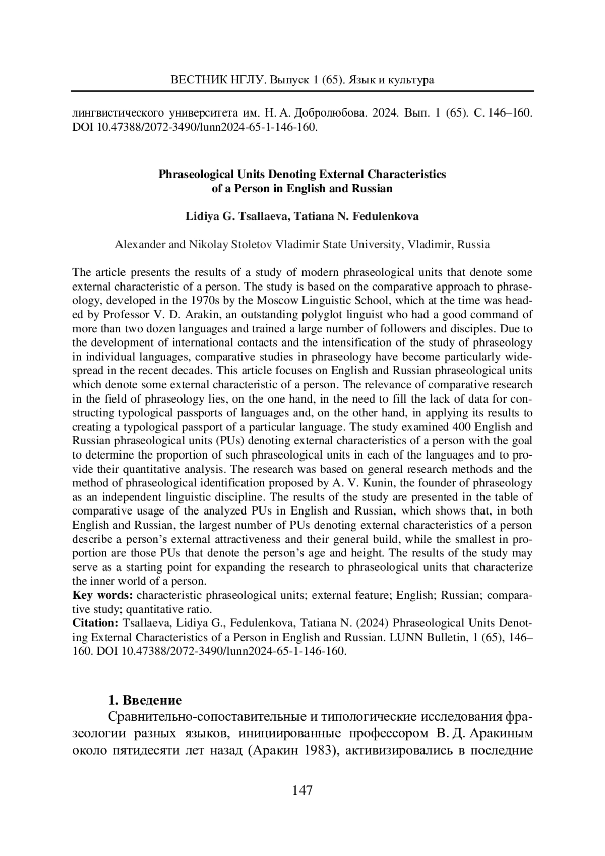 В предлагаемой статье излагаются результаты исследования широко используемых в современном дискурсе фразеологических единиц со значением внешнего признака, проведенного в русле сравнительно-сопоставительного подхода. Данный подход к изучению фразеологии был инициирован в 70-е годы ХХ века Московской лингвистической школой во главе с выдающимся лингвистом-полиглотом, владеющим в совершенстве более чем двумя десятками языков, проф. В. Д. Аракиным и его учениками и последователями. В связи с развитием международных контактов и интенсификацией изучения фразеологии в отдельных языках особое распространение в последние десятилетия получает сопоставление в области фразеологии. Данная статья рассматривает фразеологические единицы, характеризующие внешние признаки человека. Сравнительный анализ проводится на материале английского и русского языков. Актуальность сопоставительных исследований в области фразеологии, с одной стороны, заключается в необходимости восполнения недостатка данных для построения типологических паспортов отдельных языков и, с другой стороны, обусловлена возможностью применения их результатов в создании типологического паспорта конкретного языка. Объектом исследования являются четыре сотни английских и русских фразеологических единиц, характеризующих внешние признаки человека. Предметом исследования является изучение доли признаковых фразеологических единиц в каждом из избранных языков и их квантитативный анализ. В работе применялись общепарадигмальные методы исследования и метод фразеологической идентификации, предложенный основателем фразеологии как самостоятельной лингвистической дисциплины А. В. Куниным. Результаты исследования представлены в таблице сравнительного употребления анализируемых ФЕ в английском и русском языке, которая показывает, что большая часть фразеологизмов как английского, так и русского языка, указывающих на внешние признаки человека, характеризуют внешнюю привлекательность и комплекцию человека, наименьшее количество фразеологизмов принадлежит к тематическим подгруппам, обозначающим возраст и рост человека. Перспектива работы видится в расширении поля исследования за счет фразеологизмов, характеризующих внутренний мир человека.