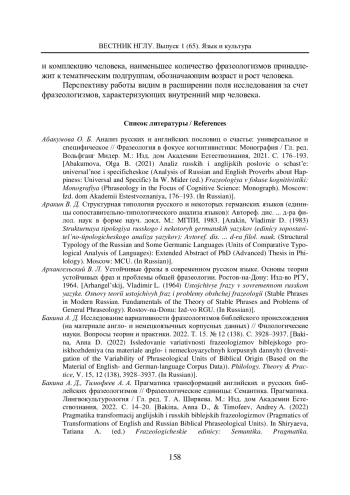 1. Абакумова О. Б. Анализ русских и английских пословиц о счастье: универсальное и специфическое // Фразеология в фокусе когнитивистики: Монография / Гл. ред. Вольфганг Мидер. М.: Изд. дом Академии Естествознания, 2021. С. 176-193.