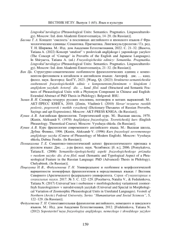 14. Федуленкова Т. Н. Типологически релевантные параметры описания фразеологических единиц (на материале английского, немецкого и шведского языков) // Фразеологическое пространство национального словаря в сопоставительном аспекте: Монография. Т. 2 / Под ред. Т. Н. Федуленковой. М.: Изд. дом Академии Естествознания, 2014. С. 11-17.