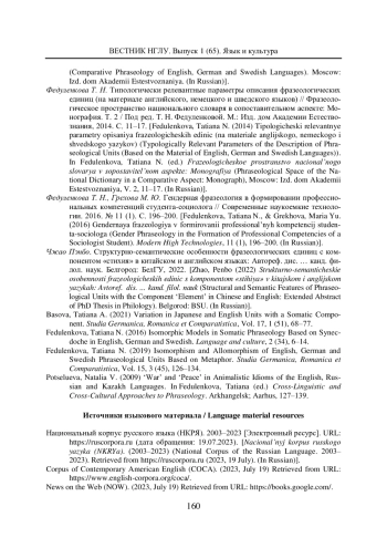19. Fedulenkova, Tatiana N. (2019) Isomorphism and Allomorphism of English, German and Swedish Phraseological Units Based on Metaphor. Studia Germanica, Romanica et Comparatistica, Vol. 15, 3 (45), 126-134.