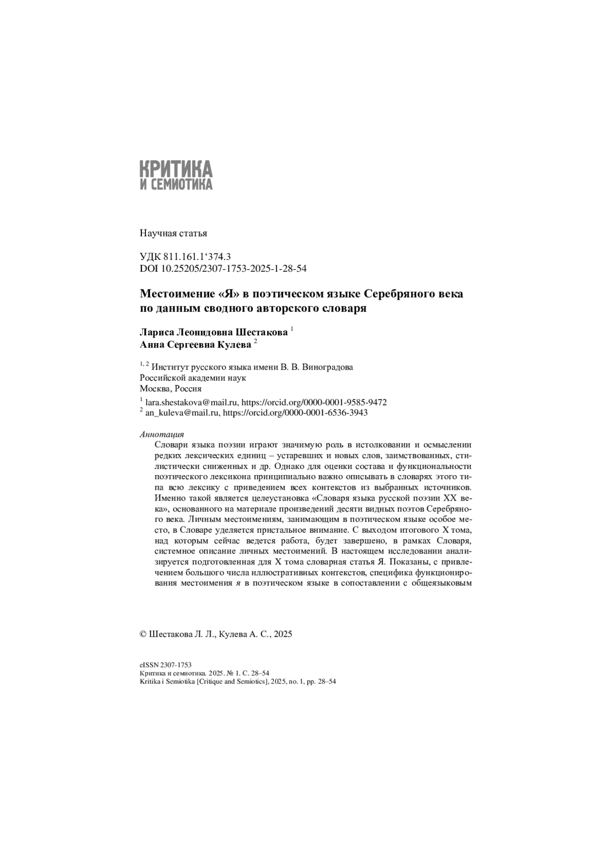 23. Кульпина В. Г. Прагматика личных местоимений в составе местоименных комплексов и диалоговых единств // Вестник РГГУ. Серия: Литературоведение. Языкознание. Культурология. 2022. № 8(1). С. 111-135. DOI: 10.28995/2686-7249-2022-8-111-135