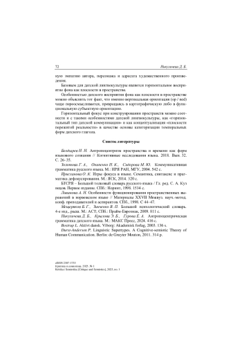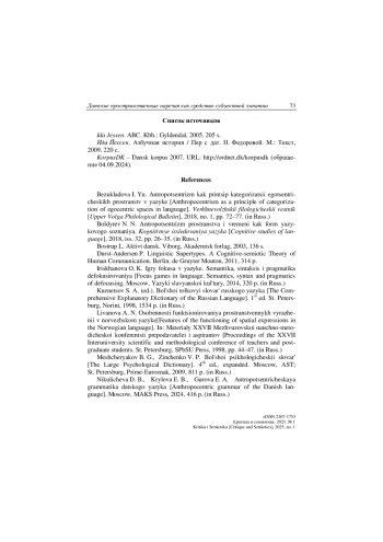 1. Болдырев Н. Н. Антропоцентризм пространства и времени как форм языкового сознания // Когнитивные исследования языка. 2018. Вып. 32. С. 26-35.
