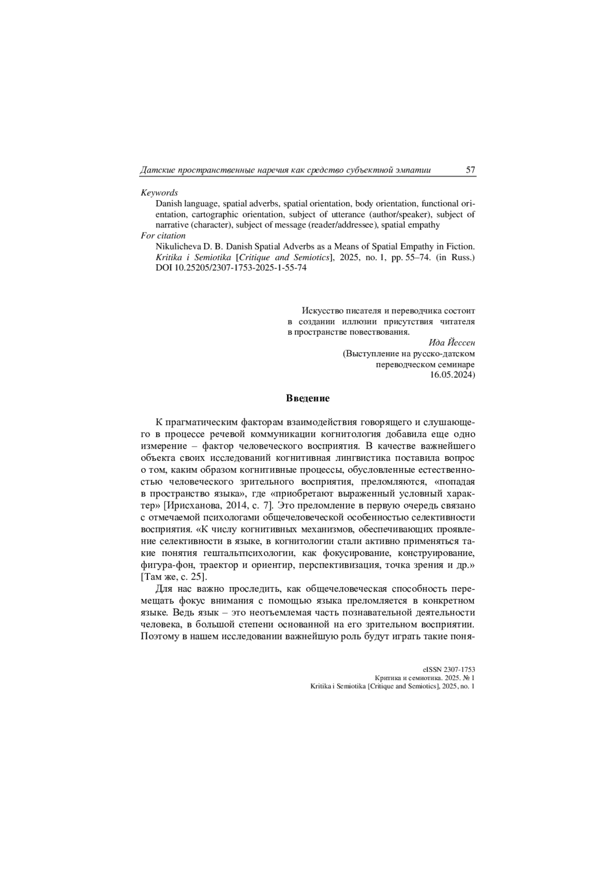 Статья посвящена выявлению того, как взаимодействие субъектов коммуникации отражается в использовании пространственных наречий носителями датского языка. Хотя пространственные ориентиры «Я» / «Другой человек» / «Объекты внешнего мира», в принципе, присутствуют во всех языках, соотношение их удельного веса существенно отличается от языка к языку. Это иллюстрируется на материале сопоставления параллельных датских и русских художественных текстов. Будет показано, каким образом использование датских пространственных наречий (системно опускаемых при переводе на русский язык) приводит к «совмещению точки отсчета» субъекта высказывания, субъекта адресации и субъекта повествования, что создает коммуникативно-прагматический эффект, который мы предлагаем называть «пространственной эмпатией».