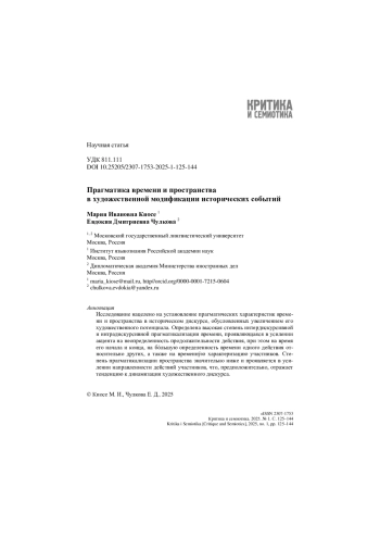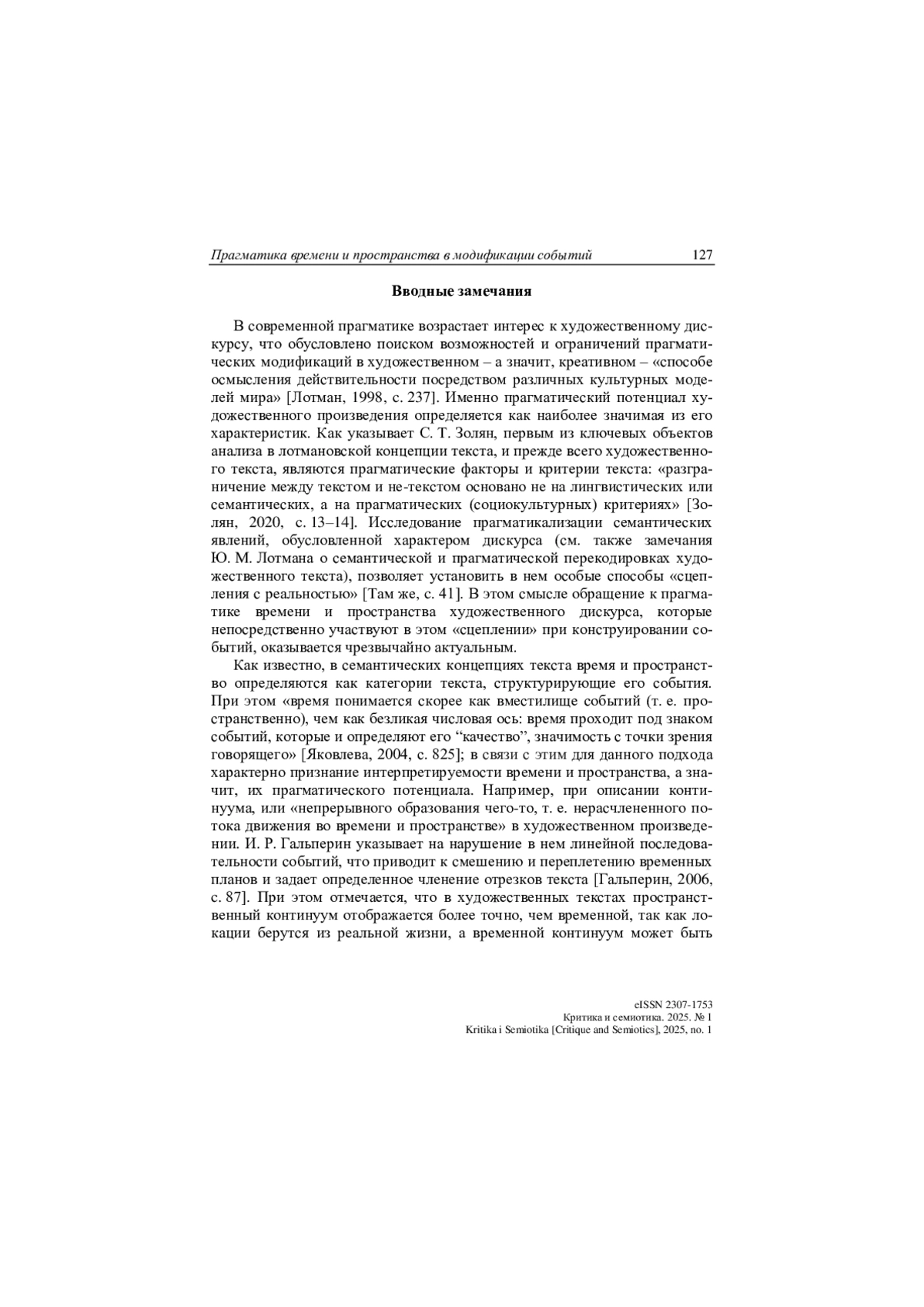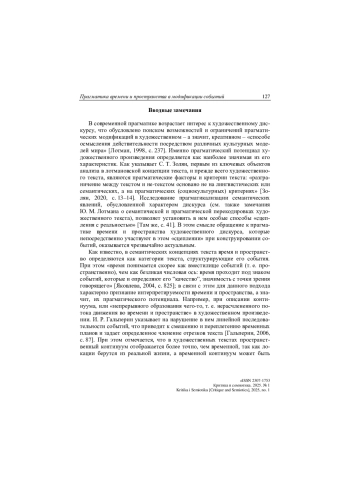 В современной прагматике возрастает интерес к художественному дискурсу, что обусловлено поиском возможностей и ограничений прагматических модификаций в художественном – а значит, креативном – «способе осмысления действительности посредством различных культурных моделей мира» [Лотман, 1998, c. 237]. Именно прагматический потенциал художественного произведения определяется как наиболее значимая из его характеристик. Как указывает С. Т. Золян, первым из ключевых объектов анализа в лотмановской концепции текста, и прежде всего художественного текста, являются прагматические факторы и критерии текста: «разграничение между текстом и не текстом основано не на лингвистических или семантических, а на прагматических (социокультурных) критериях» [Зо-лян, 2020, c. 13–14]. Исследование прагматикализации семантических явлений, обусловленной характером дискурса (см. также замечания Ю. М. Лотмана о семантической и прагматической перекодировках художественного текста), позволяет установить в нем особые способы «сцепления с реальностью» [Там же, c. 41]. В этом смысле обращение к прагматике времени и пространства художественного дискурса, которые непосредственно участвуют в этом «сцеплении» при конструировании событий, оказывается чрезвычайно актуальным.
