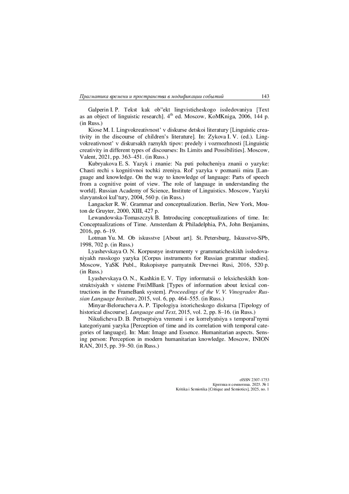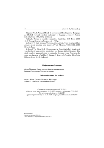 4. Зыкова И. В., Киосе М. И. Параметризация лингвистической креативности в междискурсивном аспекте: кинодискурс vs дискурс детской литературы // Вопросы когнитивной лингвистики. 2020. № 2. С. 26-40.