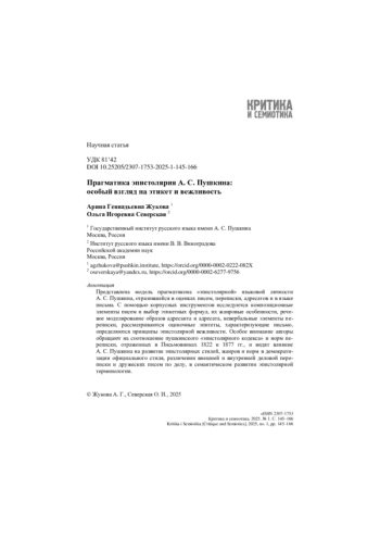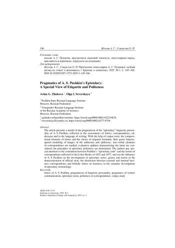 Представлена модель прагматикона «эпистолярной» языковой личности А. С. Пушкина, отразившейся в оценках писем, переписки, адресатов и в языке письма. С помощью корпусных инструментов исследуются композиционные элементы писем и выбор этикетных формул, их жанровые особенности, речевое моделирование образов адресанта и адресата, невербальные элементы переписки, рассматриваются оценочные эпитеты, характеризующие письмо, определяются принципы эпистолярной вежливости. Особое внимание авторы обращают на соотношение пушкинского «эпистолярного кодекса» и норм переписки, отраженных в Письмовниках 1822 и 1877 гг., и видят влияние А. С. Пушкина на развитие эпистолярных стилей, жанров и норм в демократизации официального стиля, различении внешней и внутренней деловой переписки и дружеских писем по делу, в семантическом развитии эпистолярной терминологии.