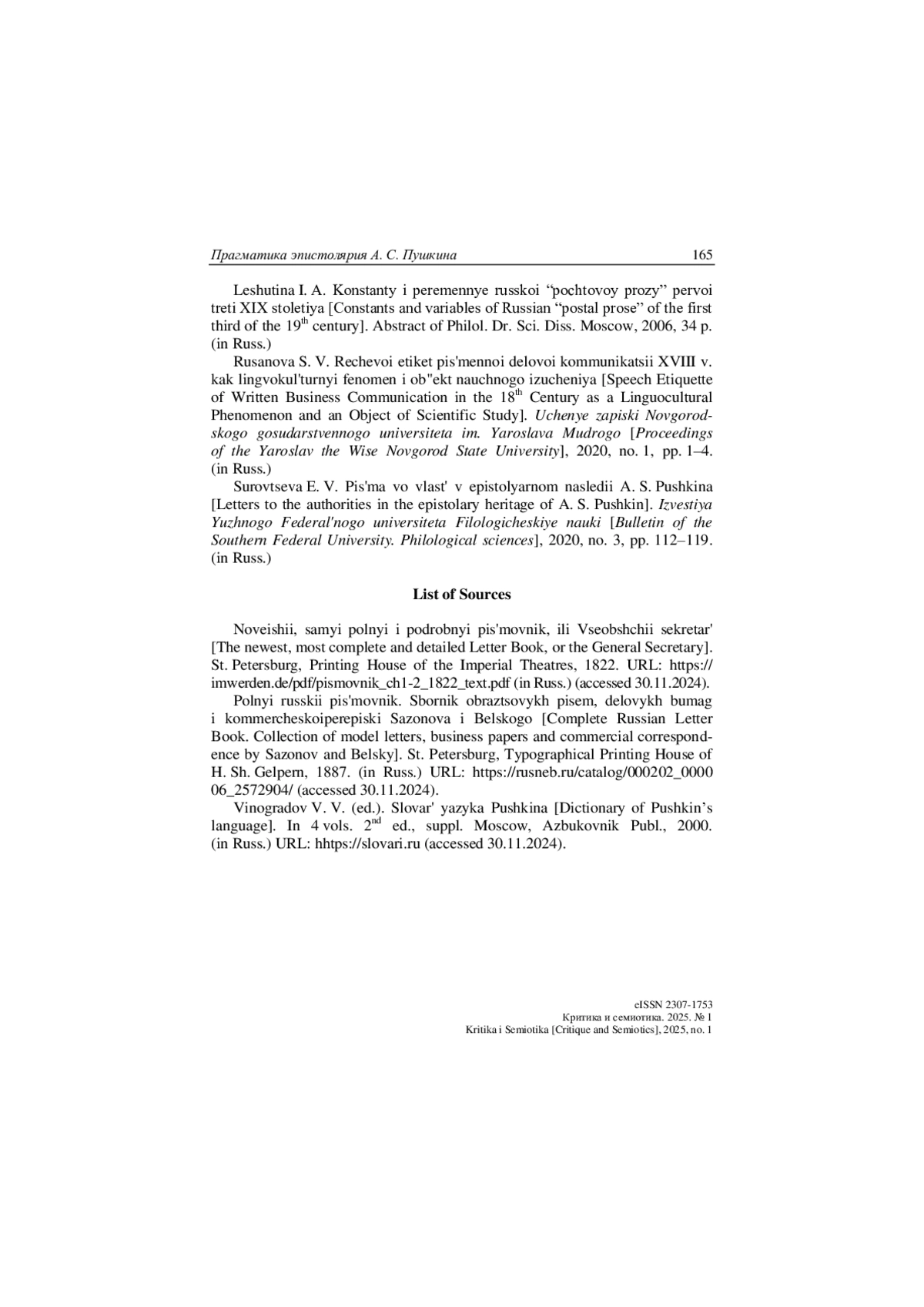 7. Кайзер Л. Э. Речевой этикет в письмах А. С. Пушкина // Культура и текст. 1999. № 5. С. 47-60.