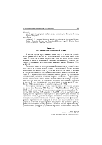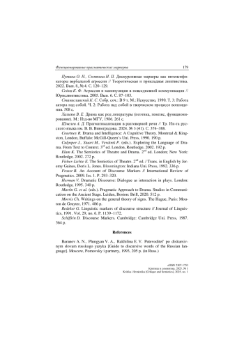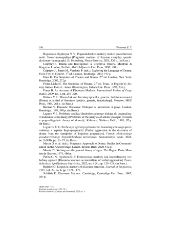 Представлены результаты анализа прагматических маркеров в текстах драматургических произведений. Материалом исследования послужили пьесы отечественных авторов (А. Чехов, А. Арбузов, Н. Садур), относящиеся к разным направлениям драматургии. Основная задача сводилась к тому, чтобы определить наиболее частотные типы прагматических маркеров, участвующие в вербальной репрезентации агрессии в драме. Исходным было положение о том, что речевая агрессия является элементом поэтики драмы, обусловливает развитие драматического конфликта. Также учитывалось, что прагматически нагруженными оказываются определенные типы лингвистических и паралингвистических единиц в репликах персонажей. Обратившись к списку частотных прагматических маркеров русского языка, разработанному Н. В. Богдановой-Бегларян, мы предприняли попытку выявить типы маркеров при продуцировании речевой агрессии, что предполагало использование количественных и качественных методов. Как показали результаты, прагматические маркеры в драме демонстрируют активность в зависимости от реализуемых функций. Наиболее активны разграничительные и метакоммуникативные прагматические маркеры. В случае речевой агрессии прагматические маркеры реализуют прежде всего функцию усиления. Вместе с тем их использование не частотно в репликах персонажей. Представляется, что для более точной оценки вклада прагматических маркеров в создание речевой агрессии в драме необходим расширенный корпус современных драматургических произведений на разных языках. Исследование также имеет перспективу в плане привлечения методов корпусного аннотирования.