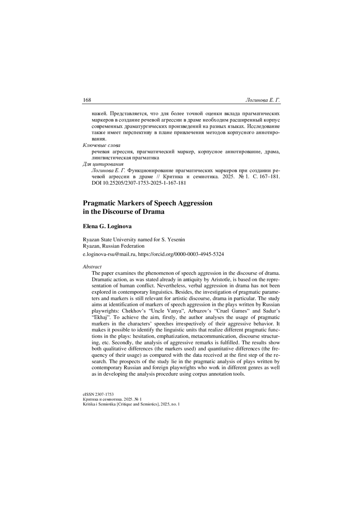 4. Логинова Е. Г. Речевая агрессия персонажей драматургического произведения в аспекте лингвопрагматики // Вестник Моск. гос. лингвист. ун-та. Гуманитарные науки. 2024. Вып. 9 (890). С. 73-79.