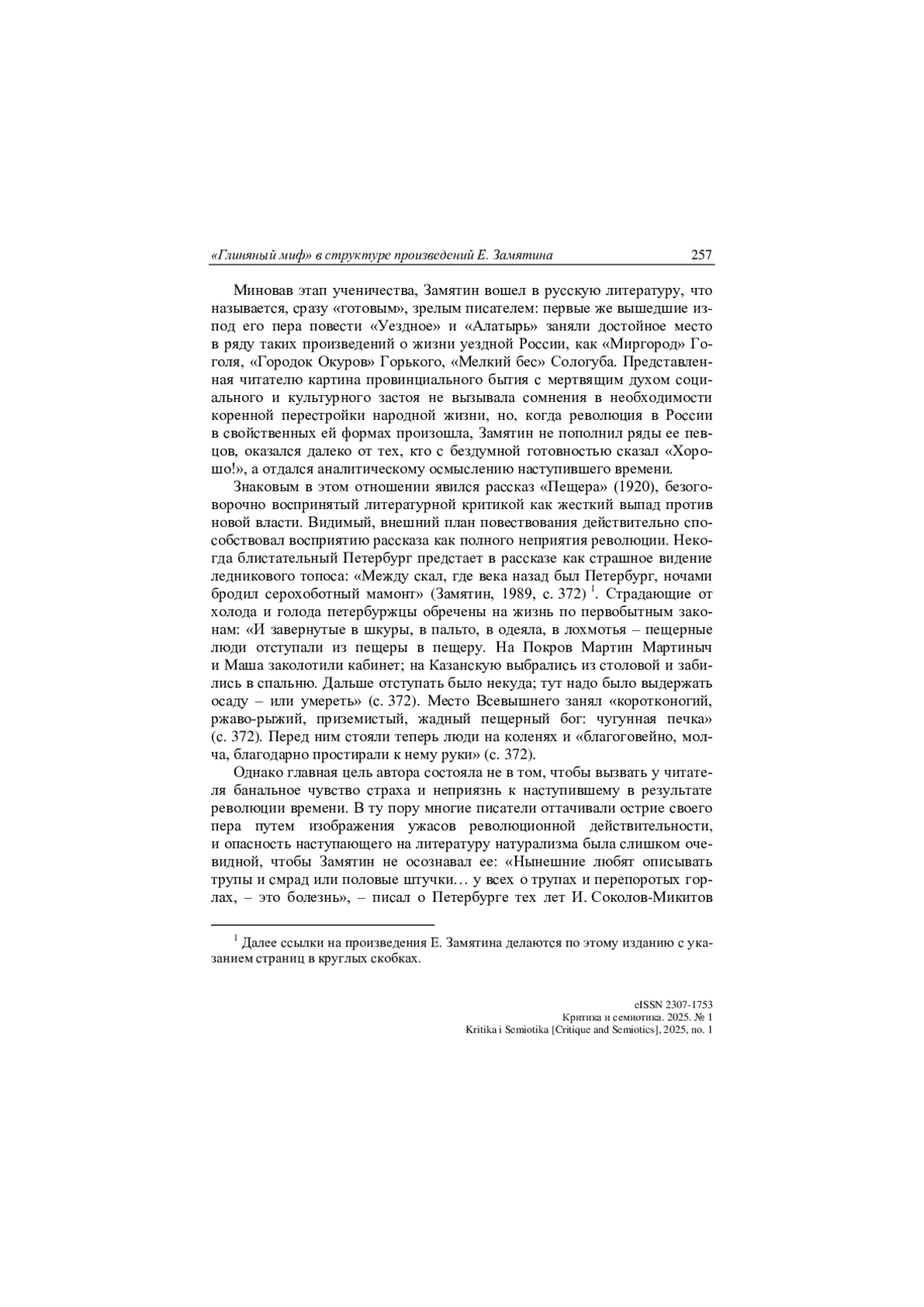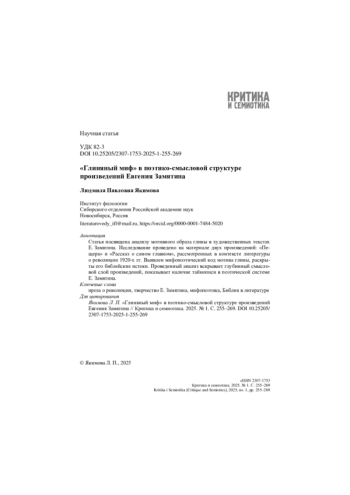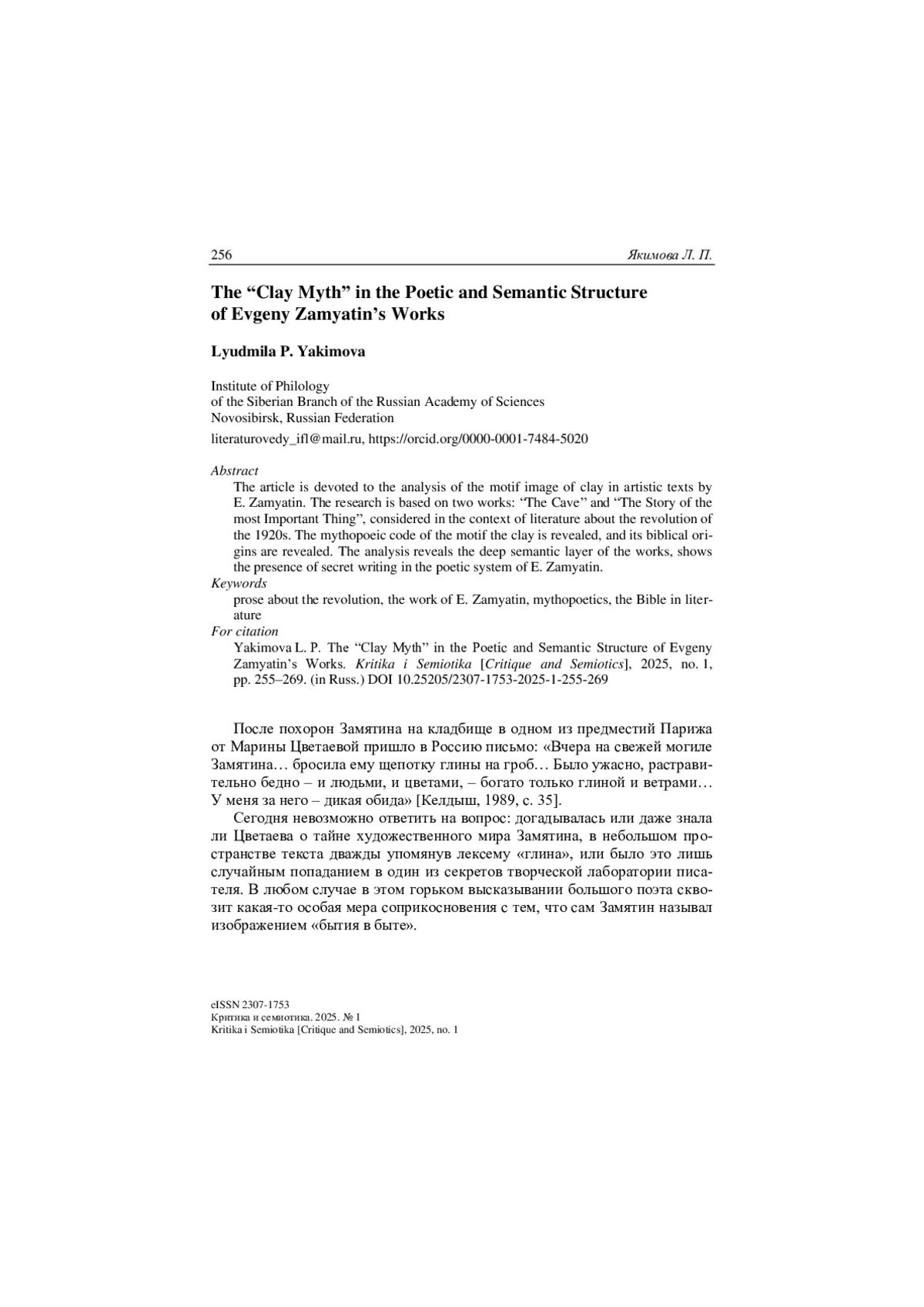 Статья посвящена анализу мотивного образа глины в художественных текстах Е. Замятина. Исследование проведено на материале двух произведений: «Пещера» и «Рассказ о самом главном», рассмотренных в контексте литературы о революции 1920-х гг. Выявлен мифопоэтический код мотива глины, раскрыты его библейские истоки. Проведенный анализ вскрывает глубинный смысловой слой произведений, показывает наличие тайнописи в поэтической системе Е. Замятина.