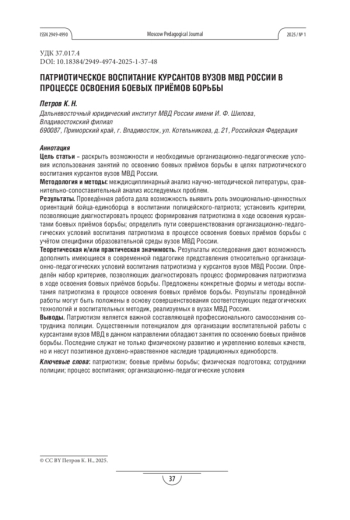 Цель статьи - раскрыть возможности и необходимые организационно-педагогические условия использования занятий по освоению боевых приёмов борьбы в целях патриотического воспитания курсантов вузов МВД России.