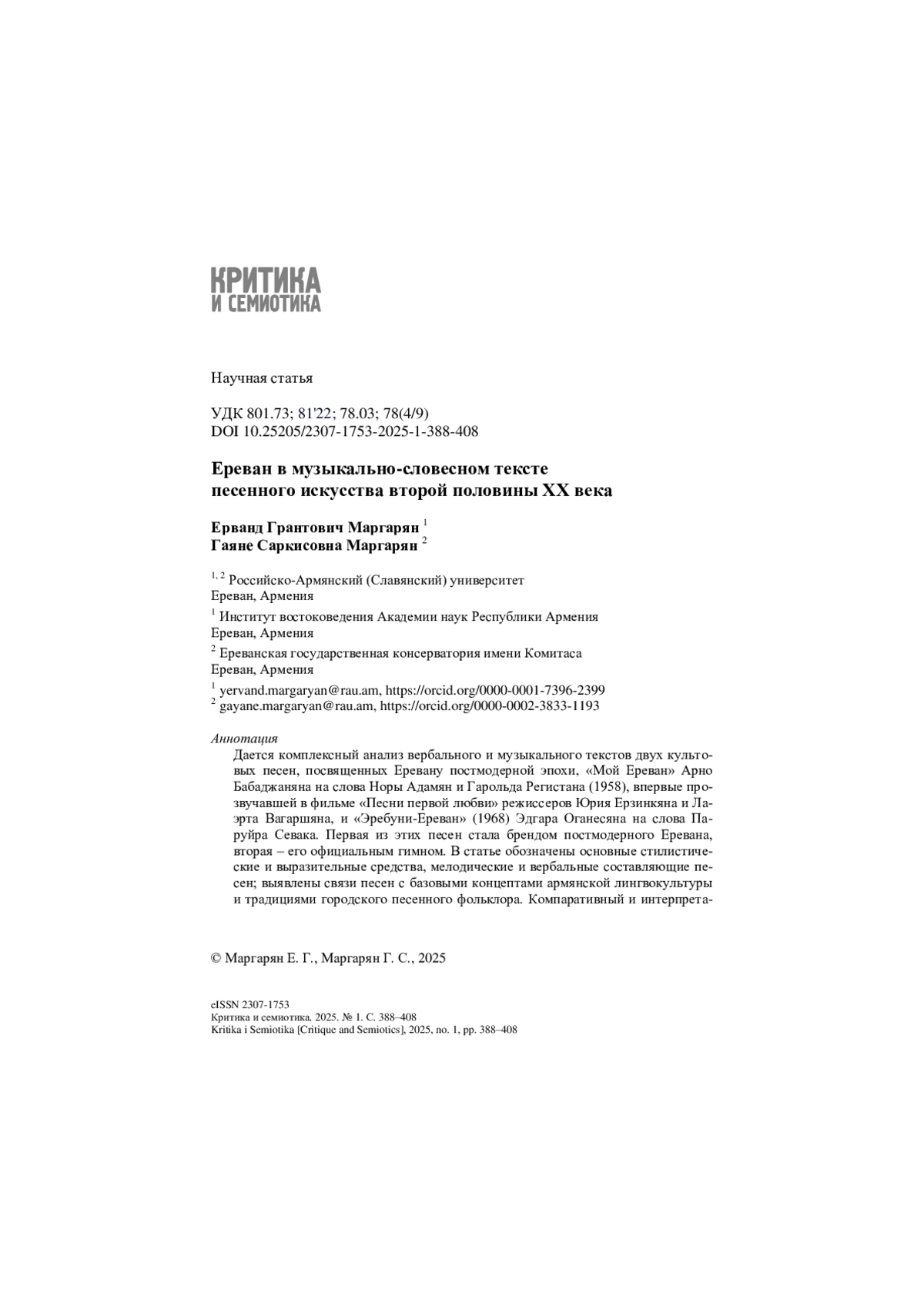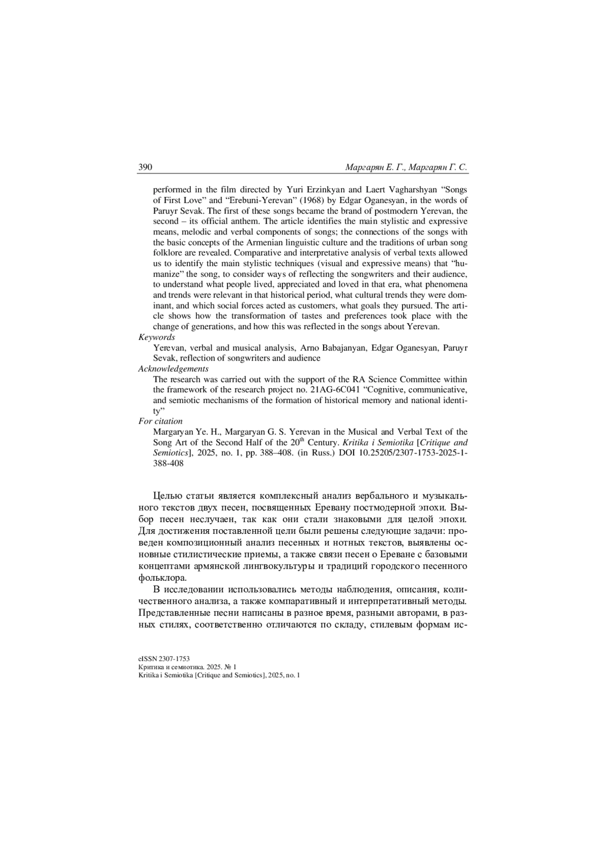 Целью статьи является комплексный анализ вербального и музыкального текстов двух песен, посвященных Еревану постмодерной эпохи. Выбор песен неслучаен, так как они стали знаковыми для целой эпохи. Для достижения поставленной цели были решены следующие задачи: проведен композиционный анализ песенных и нотных текстов, выявлены основные стилистические приемы, а также связи песен о Ереване с базовыми концептами армянской лингвокультуры и традиций городского песенного фольклора.