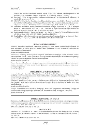 Теоретическая и/или практическая значимость. Отобраны примеры лабораторных работ, демонстрирующих проявления отдельных видов межмолекулярных взаимодействий (водородные связи, ион-дипольные, диполь-дипольные), на основе которых происходит формирование молекулярных ансамблей, обуславливающее изменения свойств системы. По мнению авторов, выполнение представленных лабораторных работ будет способствовать развитию у будущих учителей химии базовых представлений об особенностях строения и функционирования супрамолекулярных систем и формированию ключевых понятий супрамолекулярной химии для дальнейшего переноса полученных знаний в информационное пространство школьного химического образования. Возможность реализации предложенных лабораторных работ в рамках школьного курса химии как на уроках, так и во внеурочной работе при организации проектной и исследовательской деятельности, может позволить обучающимся ознакомиться с вопросами супрамолекулярной химии, как одного из крупнейших направлений развития химической науки на современном этапе.