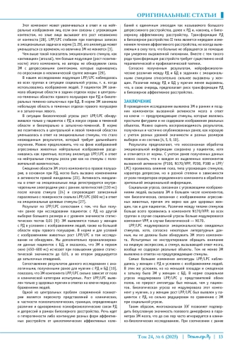 Заключение. Неосознанная обработка эмоциональной информации сохранена у пациенток, хотя и отличается от нормы. Модуляция группы компонентов при выполнении когнитивного задания может составить характерный паттерн заболевания и служить маркером при дифференциальной диагностике депрессий.