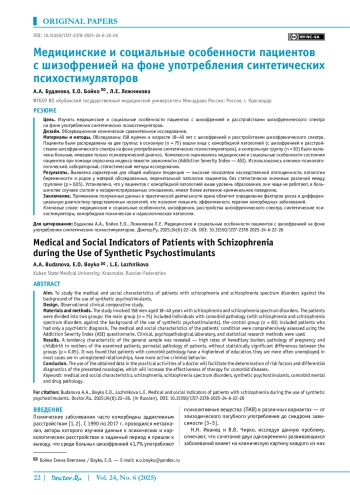 Цель. Изучить медицинские и социальные особенности пациентов с шизофренией и расстройствами шизофренического спектра на фоне употребления синтетических психостимуляторов.