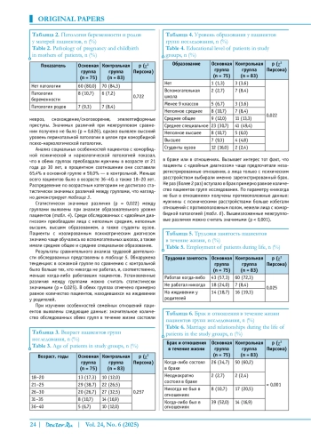 Результаты. Выявлена характерная для общей выборки тенденция — высокие показатели наследственной отягощенности, патологии беременности и родов у матерей обследованных, перинатальной патологии пациентов, без статистически значимых различий между группами (р > 0,05). Установлено, что у пациентов с коморбидной патологией выше уровень образования, они чаще не работают, в большинстве случаев состоят в незарегистрированных отношениях, имеют более активное криминальное поведение.
