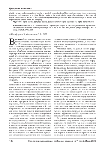 В статье рассматривается роль цифрового капитала в составе управления организацией. Определены преимущества использования цифрового капитала, которые позволяют более эффективно производить планирование, обмениваться данными, контролировать поставки, максимально снижать затраты, совершать оптимизацию рабочих процессов, помогая людям в достижении целей с меньшими усилиями, а также максимально увеличивать прибыль компании. Рассмотрены четыре формы цифрового капитала, которые в совокупности определяют продуктивность его использования: материальный актив компьютерного капитала, нематериальный актив цифрового капитала, информационный капитал и интеллектуальный капитал. Изучено понятие комплементарных активов в виде цифрового, человеческого, организационного капитала. Эти ресурсы дополняют друг друга. Повышение эффективности одного актива способствует увеличению отдачи от инвестиций в другой. Цифровой капитал представляет собой наиболее изменчивую группу активов, которая является драйвером цифровой трансформации в составе цифрового управления организациями, воздействуя на изменение человеческого и организационного капитала в составе компании.
