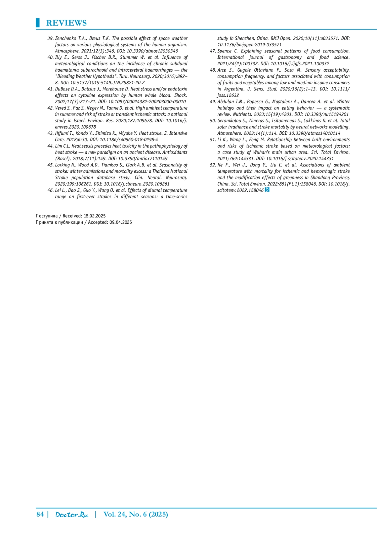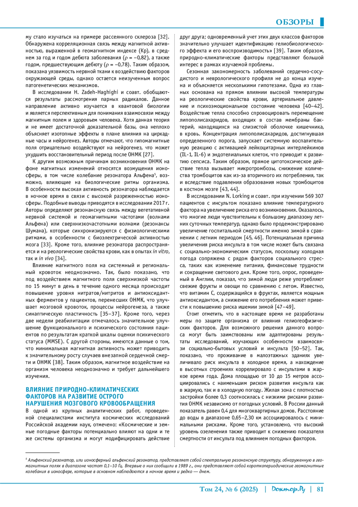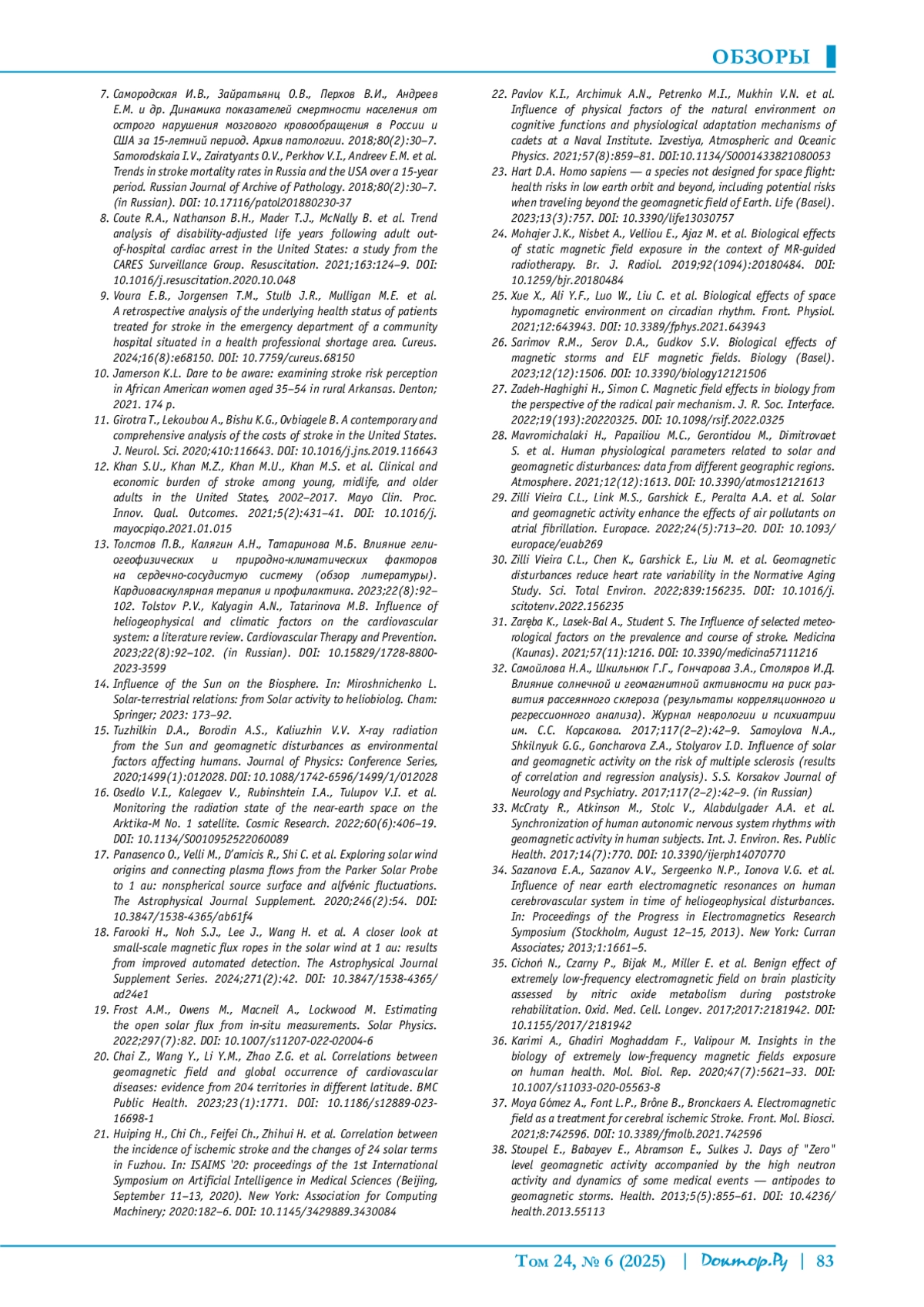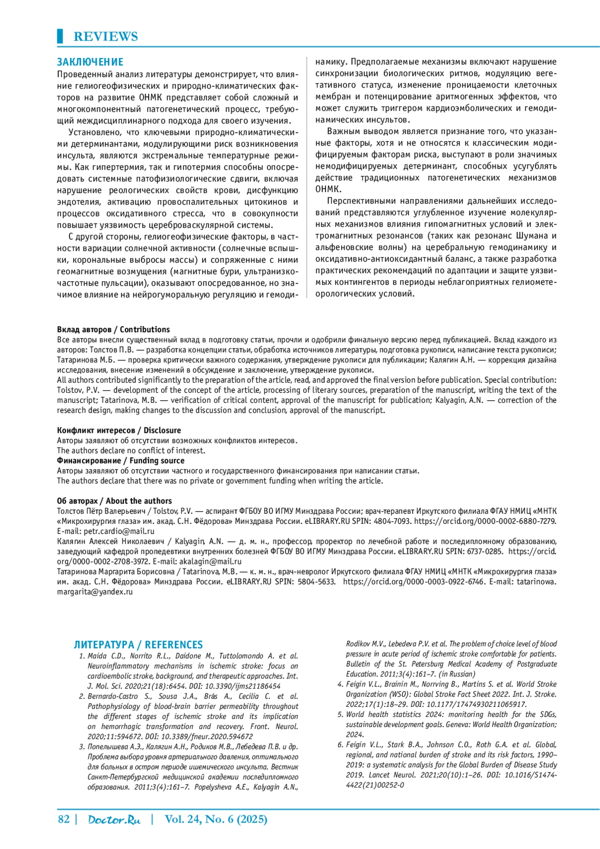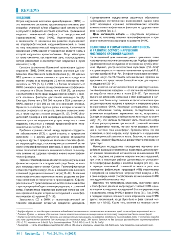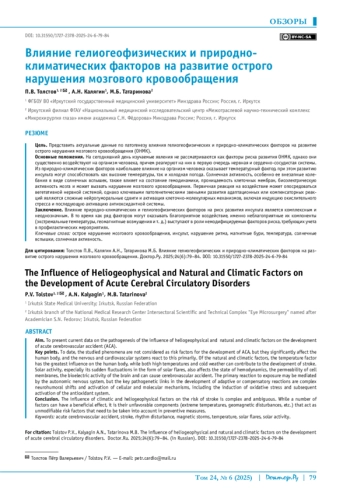 ТОЛСТОВ П. В., КАЛЯГИН А. Н., ТАТАРИНОВА М. Б. ВЛИЯНИЕ ГЕЛИОГЕОФИЗИЧЕСКИХ И ПРИРОДНОКЛИМАТИЧЕСКИХ ФАКТОРОВ НА РАЗВИТИЕ ОСТРОГО НАРУШЕНИЯ МОЗГОВОГО КРОВООБРАЩЕНИЯ // ДОКТОР. РУ. 2025. № 6, ТОМ 24