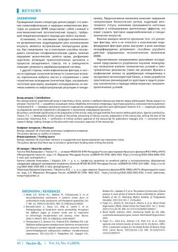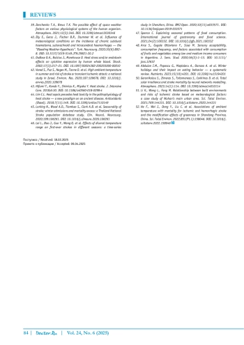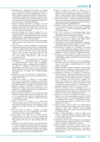 Заключение. Влияние природно-климатических и гелиогеофизических факторов на риск развития инсульта является комплексным и неоднозначным. В то время как ряд факторов могут оказывать благоприятное воздействие, именно неблагоприятные их компоненты (экстремальные температуры, геомагнитные возмущения и т. д.) выступают в роли немодифицируемых факторов риска, требующих учета в профилактических мероприятиях.