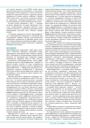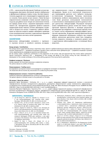 Заключение. Представленный клинический случай демонстрирует трудности диагностики лейкоэнцефолопатии с поздним дебютом заболевания. Генетическая гетерогенность наследственных форм лейкоэнцефалопатии часто требует проведения молекулярно-генетического тестирования для подтверждения диагноза. Регулярный повторный анализ необработанных данных экзома или генома и периодический пересмотр фенотипа и результатов визуализации при внедрении в клиническую практику помогут снизить частоту невыявленных лейкодистрофий в долгосрочной перспективе.