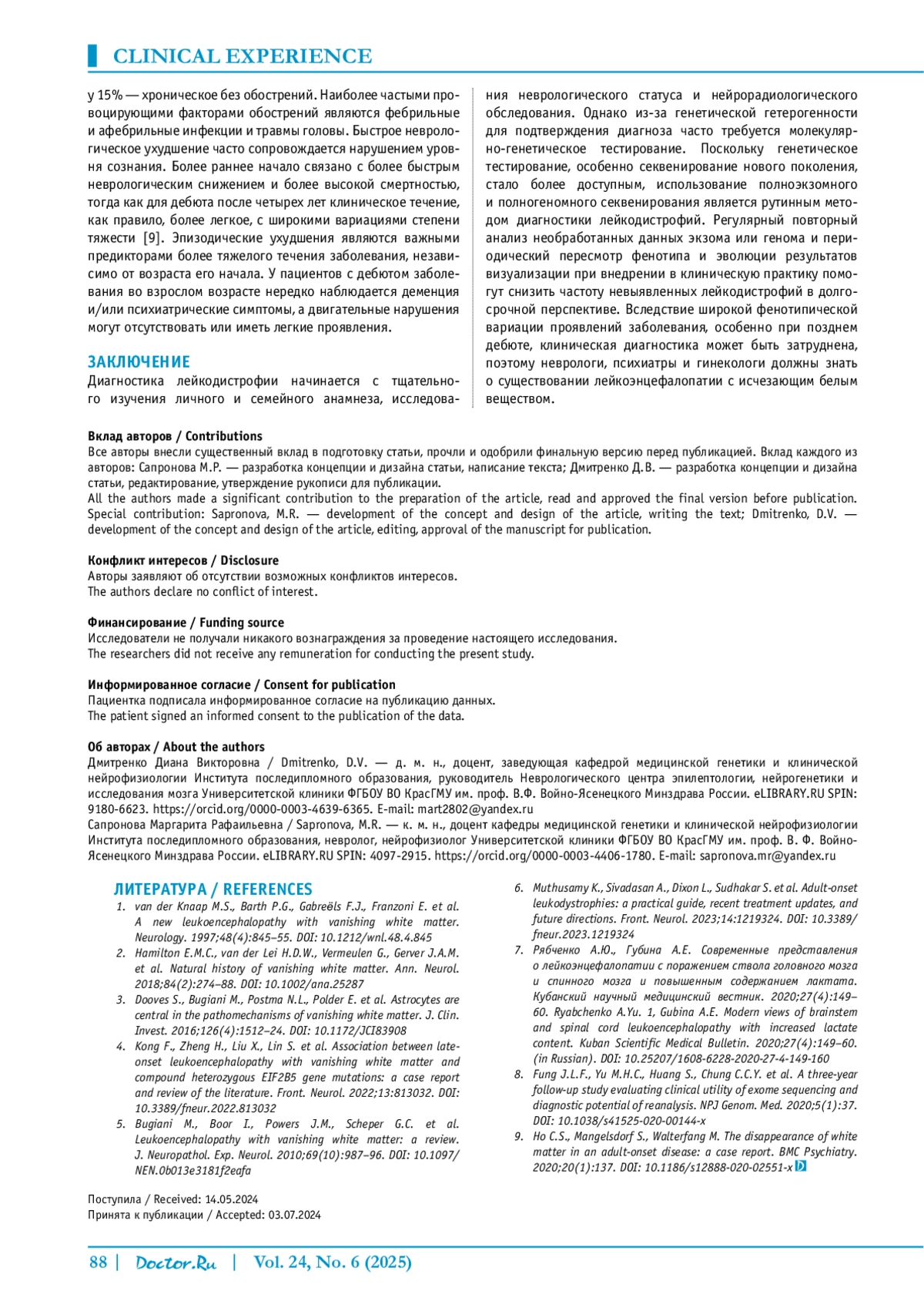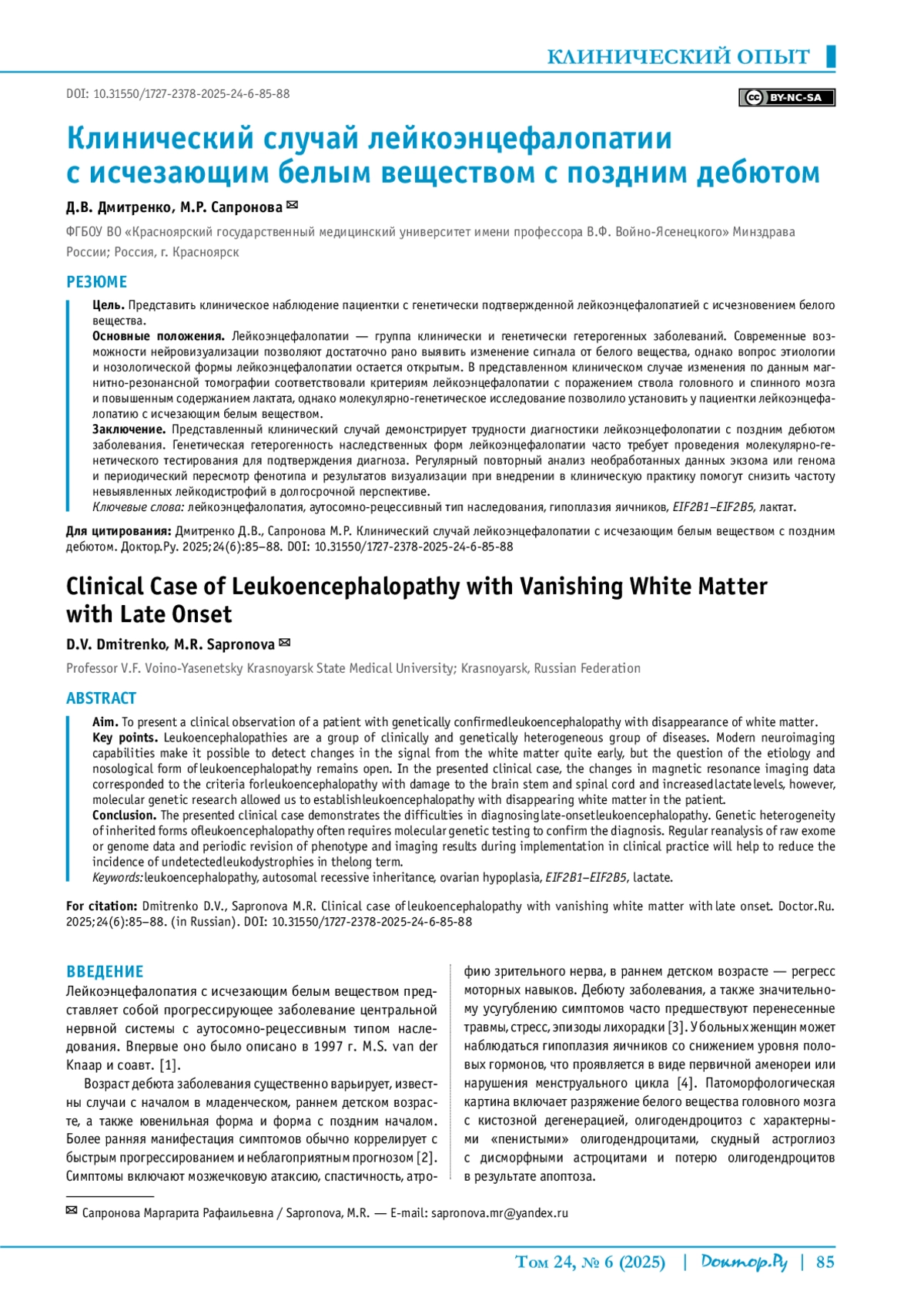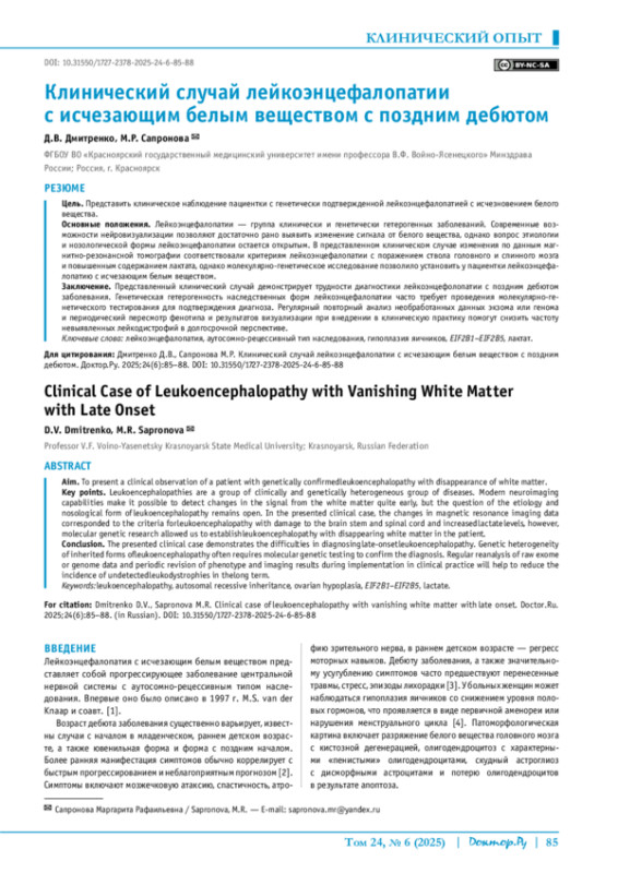 ДМИТРЕНКО Д. В., САПРОНОВА М. Р. КЛИНИЧЕСКИЙ СЛУЧАЙ ЛЕЙКОЭНЦЕФАЛОПАТИИ С ИСЧЕЗАЮЩИМ БЕЛЫМ ВЕЩЕСТВОМ С ПОЗДНИМ ДЕБЮТОМ // ДОКТОР. РУ. 2025. № 6, ТОМ 24