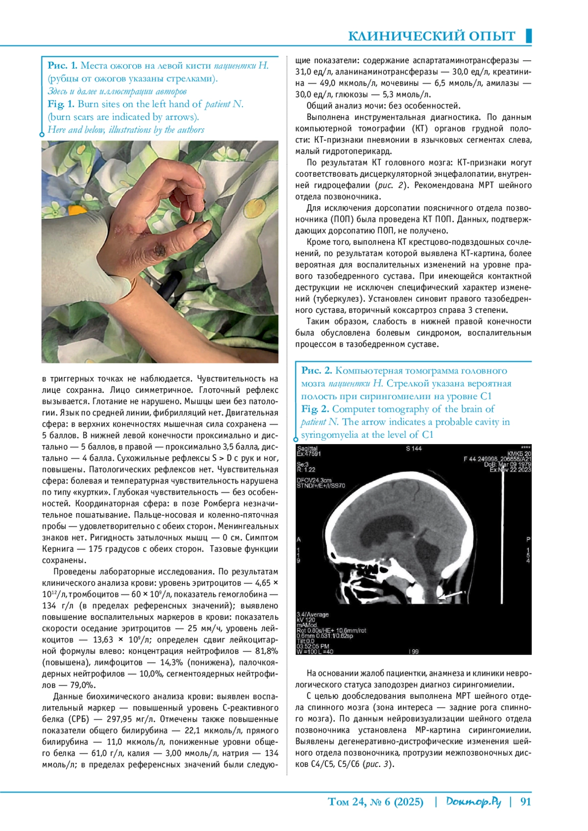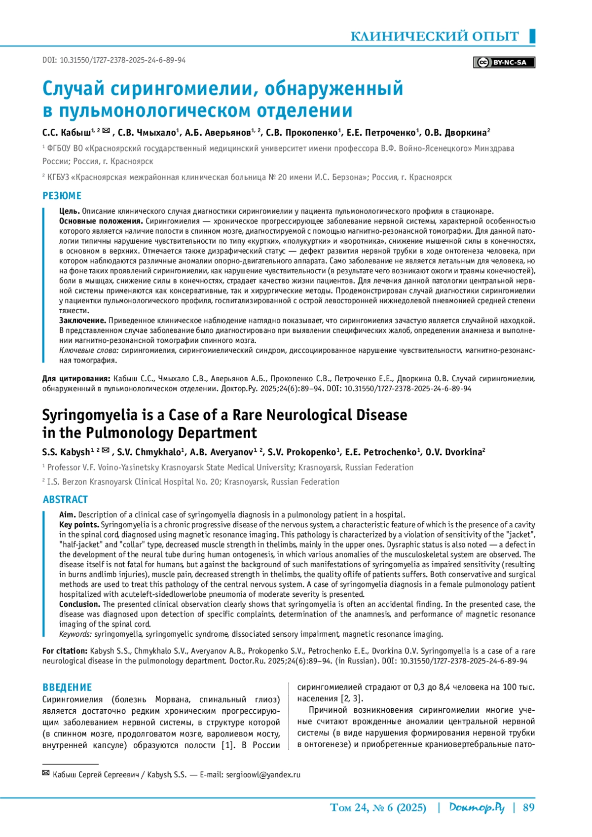 Vodojevich У.Р., Hancharuk I.M., Laryionova I.N., Revina N.V. Case of late diagnosis of syringomyelia. Medical Care: Scientific and Practical Therapeutic Journal. 2020;3(73):62-6. (in Russian).