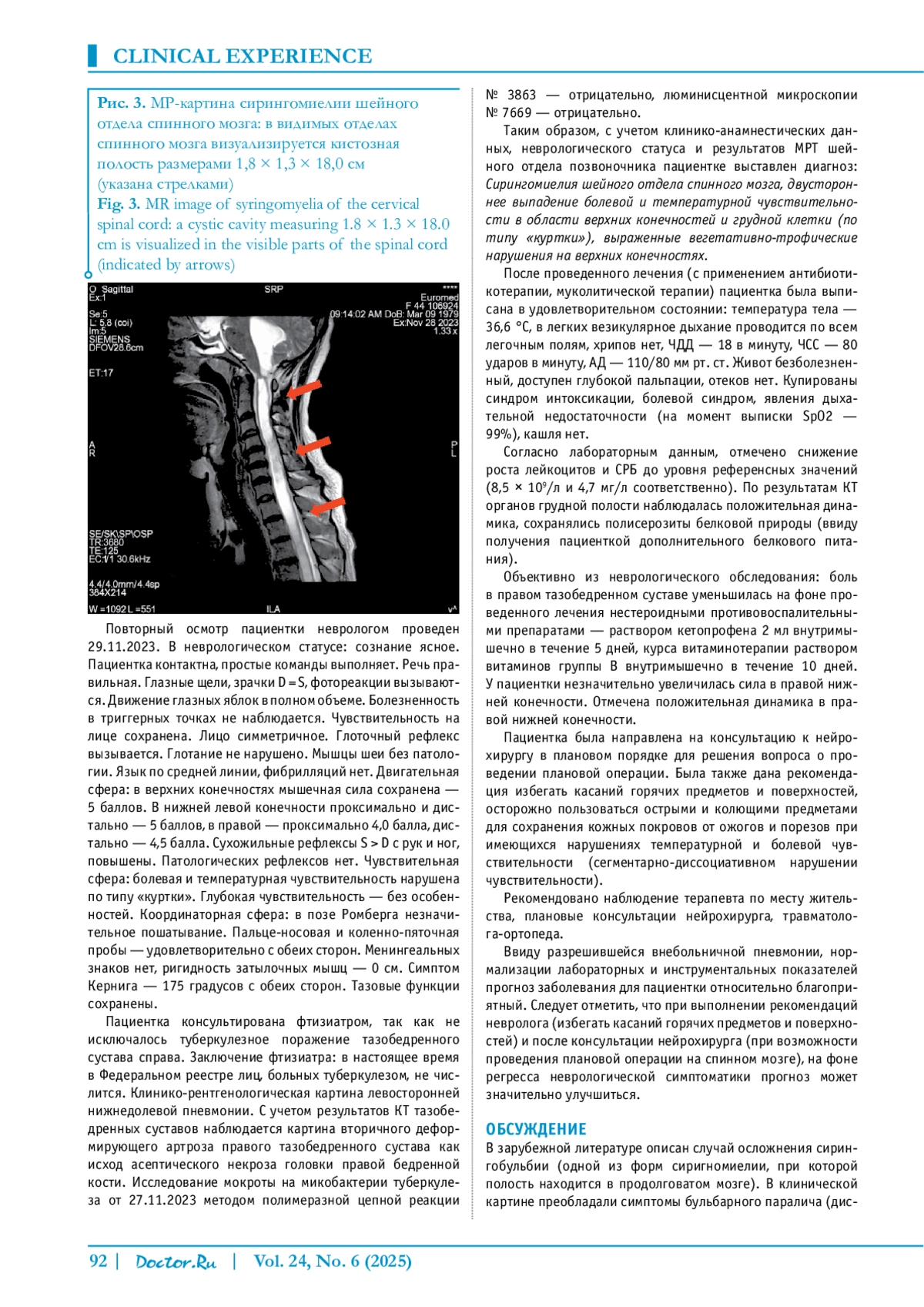 Основные положения. Сирингомиелия — хроническое прогрессирующее заболевание нервной системы, характерной особенностью которого является наличие полости в спинном мозге, диагностируемой с помощью магнитно-резонансной томографии. Для данной патологии типичны нарушение чувствительности по типу «куртки», «полукуртки» и «воротника», снижение мышечной силы в конечностях, в основном в верхних. Отмечается также дизрафический статус — дефект развития нервной трубки в ходе онтогенеза человека, при котором наблюдаются различные аномалии опорно-двигательного аппарата. Само заболевание не является летальным для человека, но на фоне таких проявлений сирингомиелии, как нарушение чувствительности (в результате чего возникают ожоги и травмы конечностей), боли в мышцах, снижение силы в конечностях, страдает качество жизни пациентов. Для лечения данной патологии центральной нервной системы применяются как консервативные, так и хирургические методы. Продемонстрирован случай диагностики сирингомиелии у пациентки пульмонологического профиля, госпитализированной с острой левосторонней нижнедолевой пневмонией средней степени тяжести.