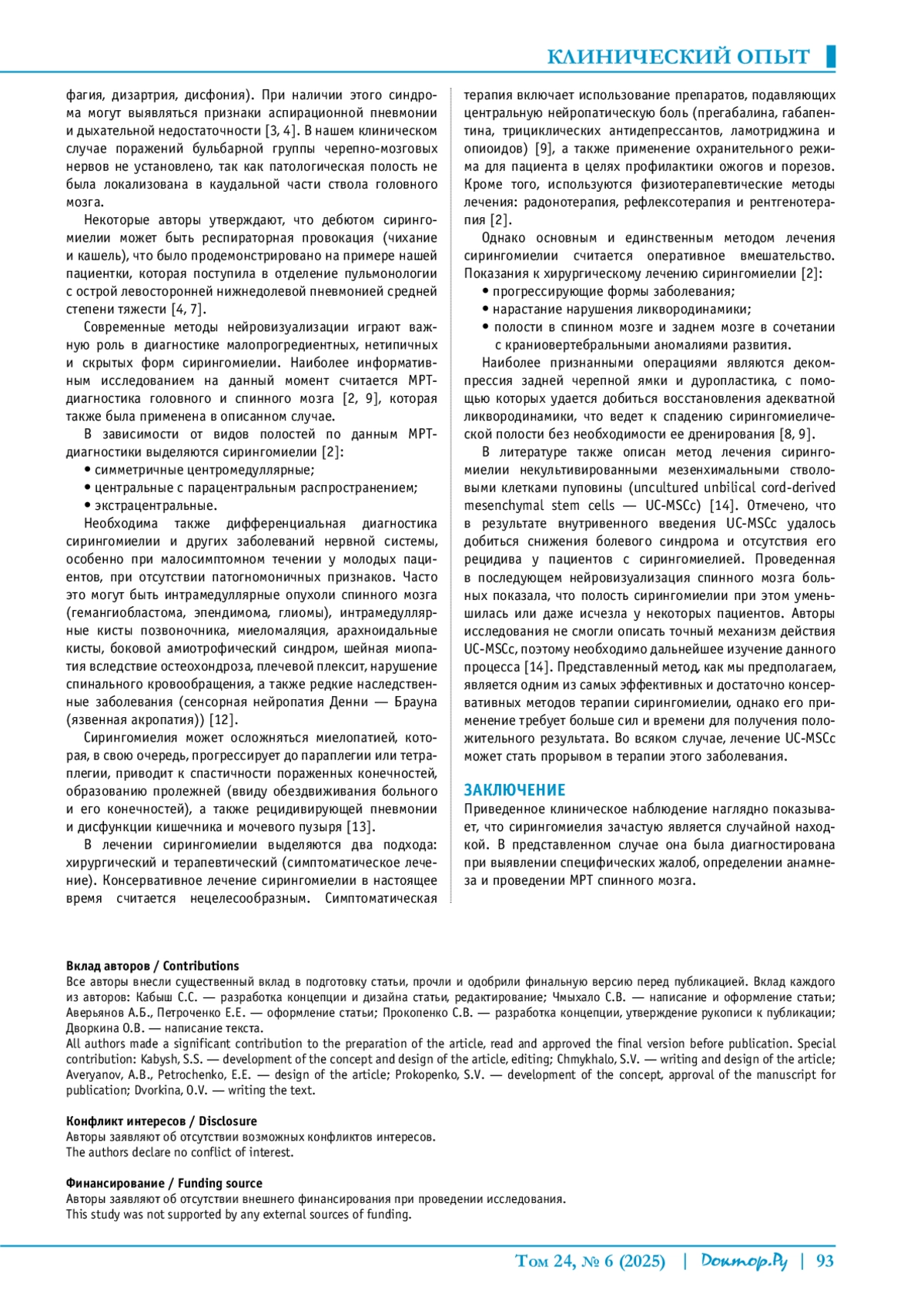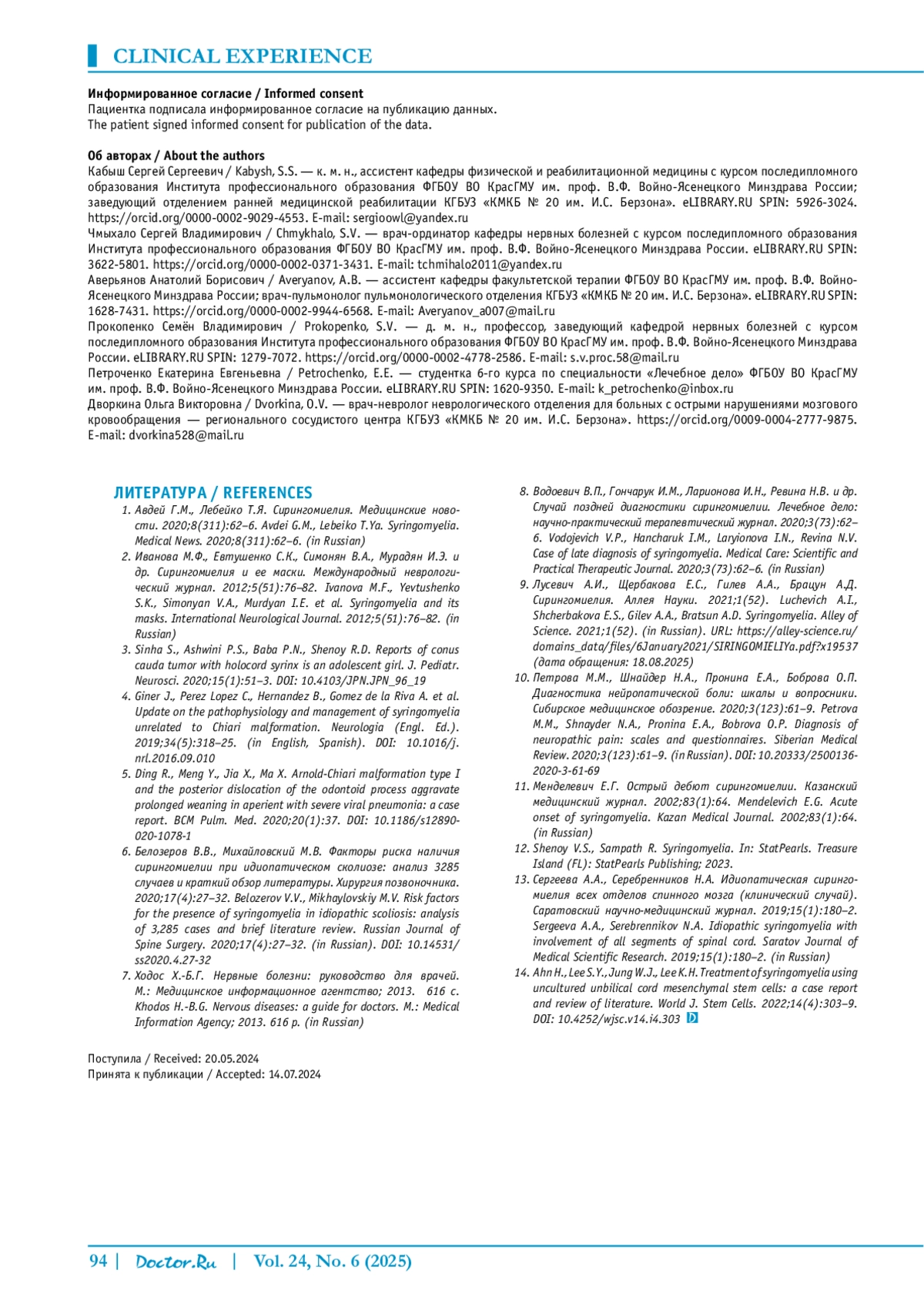 13. Сергеева A.A., Серебренников H.A. Идиопатическая сирингомиелия всех отделов спинного мозга (клинический случай). Саратовский научно-медицинский журнал. 2019;15(1):180-2.