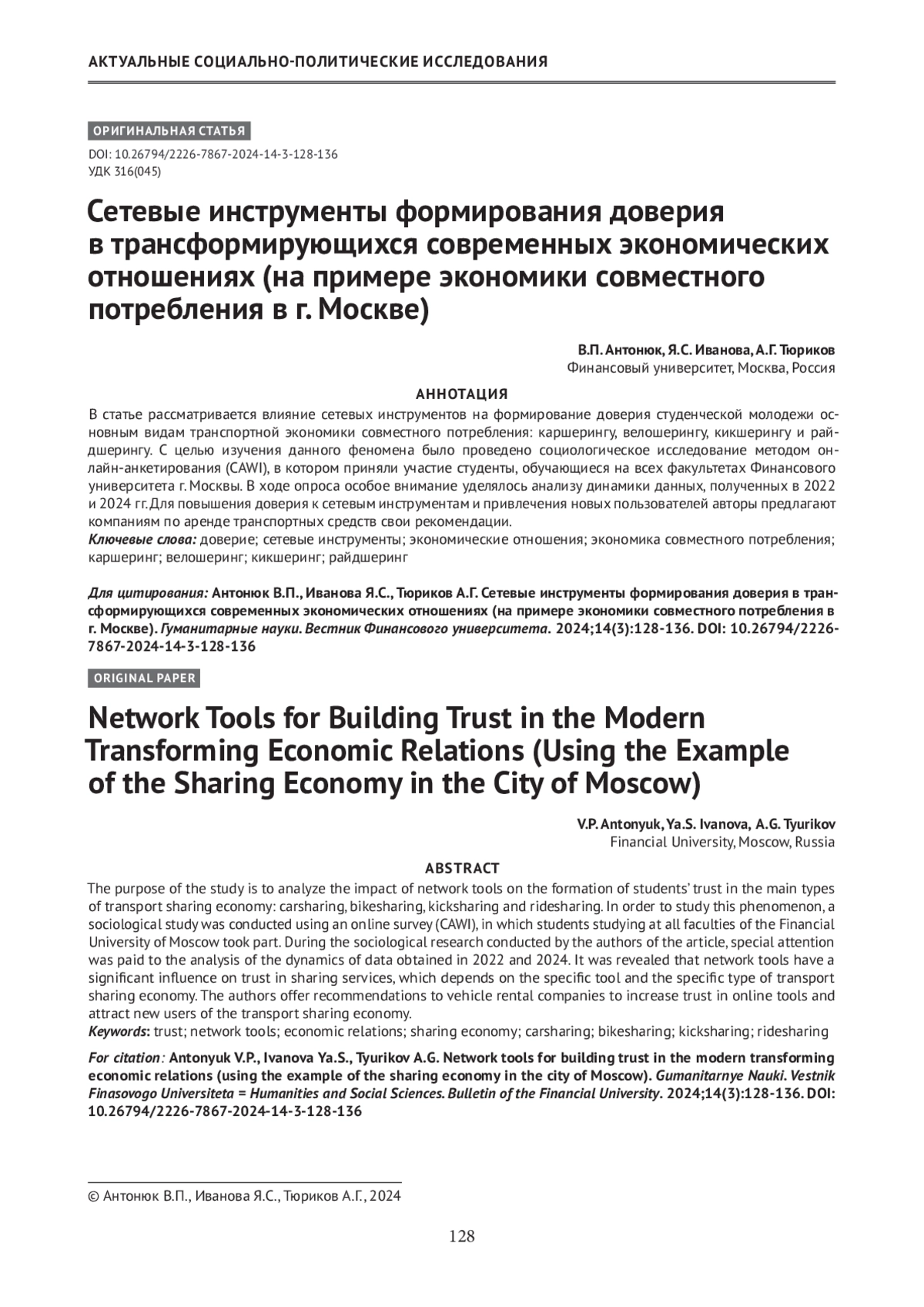 В статье рассматривается влияние сетевых инструментов на формирование доверия студенческой молодежи основным видам транспортной экономики совместного потребления: каршерингу, велошерингу, кикшерингу и райдшерингу. С целью изучения данного феномена было проведено социологическое исследование методом онлайн-анкетирования (CAWI), в котором приняли участие студенты, обучающиеся на всех факультетах Финансового университета г. Москвы. В ходе опроса особое внимание уделялось анализу динамики данных, полученных в 2022 и 2024 гг. Для повышения доверия к сетевым инструментам и привлечения новых пользователей авторы предлагают компаниям по аренде транспортных средств свои рекомендации.